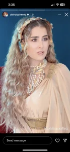 وظهرت عائشة بلوك يشبه الاميرات بشعر ذهبي طويل وكيرلي وميك اب بسيط يبرز جمالها وفستان دهبي أنيق.
