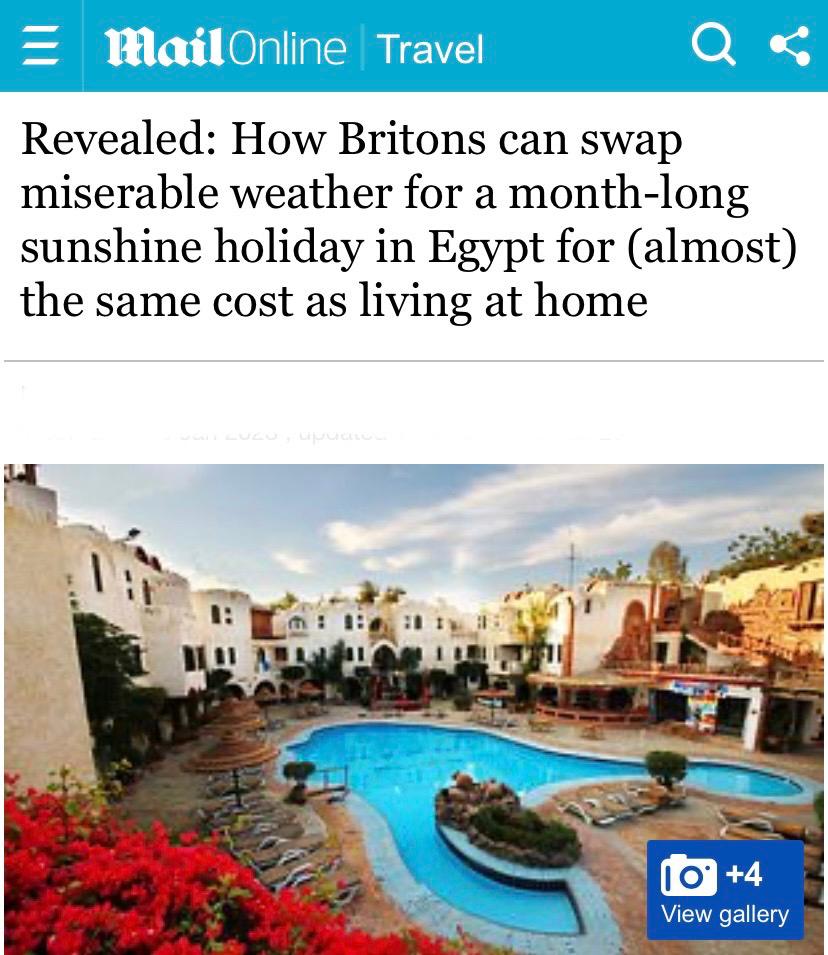 نشر موقع صحيفة Daily Mail “ديلى ميل” البريطانية الشهيرة تقريراً صحفياً سلط خلاله الضوء على الميزة التنافسية التي يتمتع بها المقصد السياحي المصري بالنسبة للسائحين البريطانيين والتي تتمثل في إمكانية قضاء إجازة طويلة به بتكلفة منخفضة، داعياً البريطانيين للهروب من الطقس البارد في بريطانيا خلال فصل الشتاء والسفر إلى مصر لقضاء أجازة ممتعة بالمدن السياحية بها حيث الطقس المشمس الدافئ، لمدة قد تصل إلى شهر بنفس تكلفة إقامتهم في منازلهم بموطنهم.