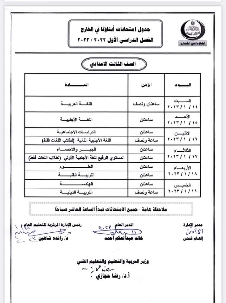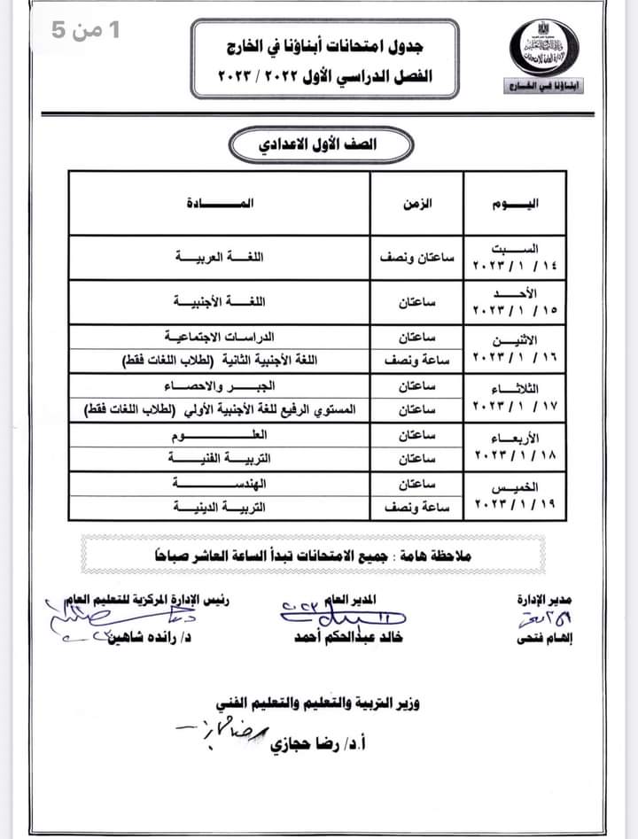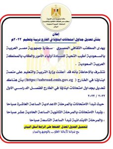 أكدت السفارة المصرية بالسعودية، أنها تلقت من وزارة التربية والتعليم إخطاراً، تم نشره عبر منصة أبناؤنا في الخارج، بتعديل بجدول امتحانات بمرحلة الفصل الدراسى الأول 2022/2023.