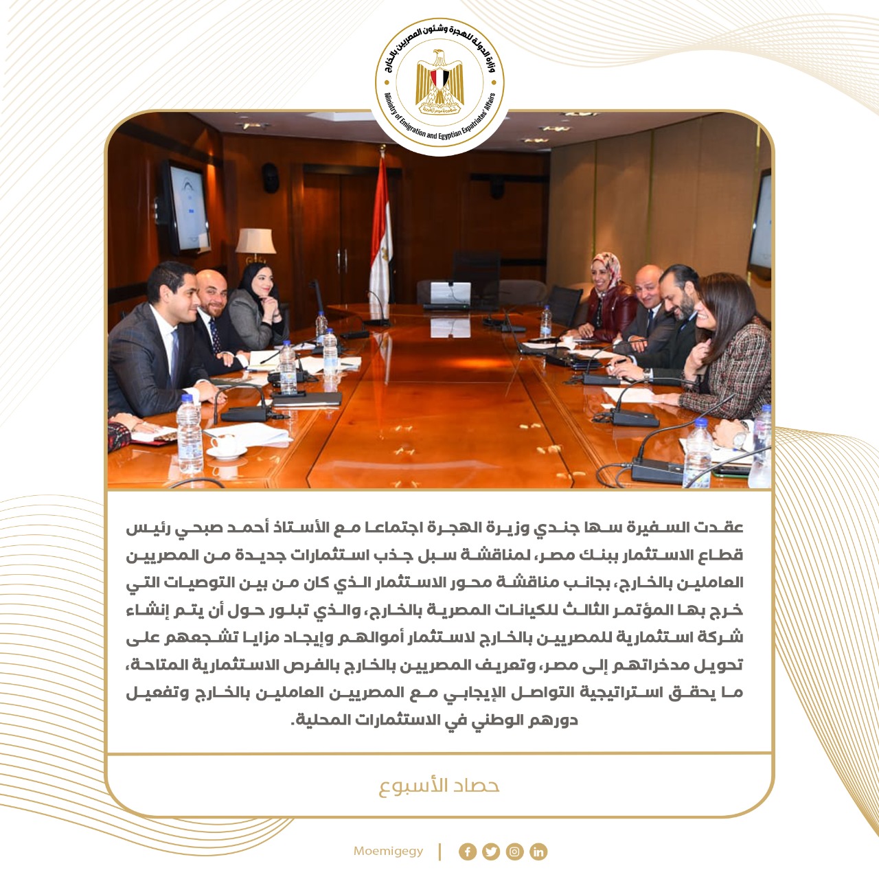 3) عقدت السفيرة سها جندي وزيرة الهجرة اجتماعا مع الأستاذ أحمد صبحي رئيس قطاع الاستثمار ببنك مصر، لمناقشة سبل جذب استثمارات جديدة من المصريين العاملين بالخارج، بجانب مناقشة محور الاستثمار الذي كان من بين التوصيات التي خرج بها المؤتمر الثالث للكيانات المصرية بالخارج، والذي تبلور حول أن يتم إنشاء شركة استثمارية للمصريين بالخارج لاستثمار أموالهم وإيجاد مزايا تشجعهم على تحويل مدخراتهم إلى مصر، وتعريف المصريين بالخارج بالفرص الاستثمارية المتاحة.
