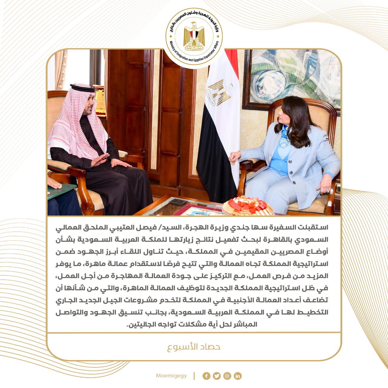 4) استقبلت السفيرة سها جندي وزيرة الهجرة، فيصل العتيبي الملحق العمالي السعودي بالقاهرة لبحث تفعيل نتائج زيارتها للملكة العربية السعودية بشأن أوضاع المصريين المقيمين في المملكة، حيث تناول اللقاء أبرز الجهود ضمن استراتيجية المملكة تجاه العمالة والتي تتيح فرصًا لاستقدام عمالة ماهرة، ما يوفر المزيد من فرص العمل، مع التركيز على جودة العمالة المهاجرة من أجل العمل، في ظل استراتيجية المملكة الجديدة لتوظيف العمالة الماهرة، والتي من شأنها أن تضاعف أعداد العمالة الأجنبية في المملكة لتخدم مشروعات الجيل الجديد الجاري التخطيط لها في المملكة العربية السعودية، بجانب تنسيق الجهود والتواصل المباشر لحل أية مشكلات تواجه الجاليتين.