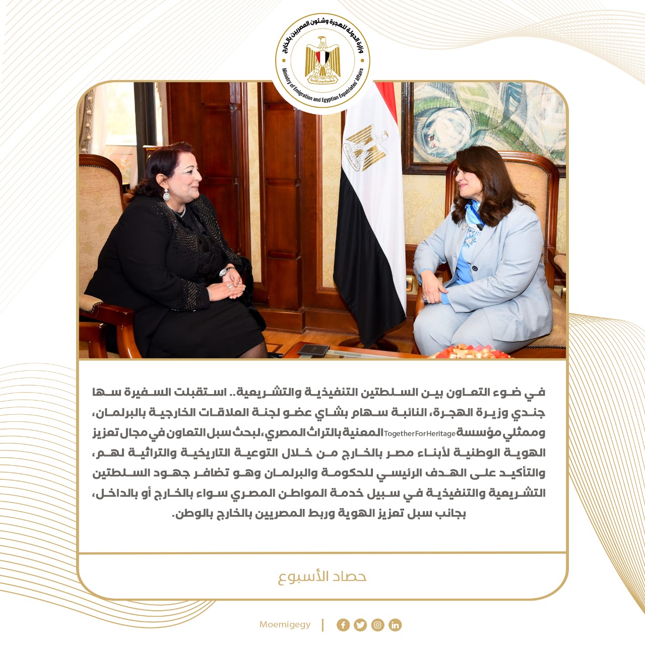 5) في ضوء التعاون بين السلطتين التنفيذية والتشريعية.. استقبلت السفيرة سها جندي وزيرة الهجرة، النائبة سهام بشاي عضو لجنة العلاقات الخارجية بالبرلمان، وممثلي مؤسسة Together For Heritage المعنية بالتراث المصري، لبحث سبل التعاون في مجال تعزيز الهوية الوطنية لأبناء مصر بالخارج من خلال التوعية التاريخية والتراثية لهم، والتأكيد على الهدف الرئيسي للحكومة والبرلمان وهو تضافر جهود السلطتين التشريعية والتنفيذية في سبيل خدمة المواطن المصري سواء بالخارج أو بالداخل، بجانب سبل تعزيز الهوية وربط المصريين بالخارج بالوطن.