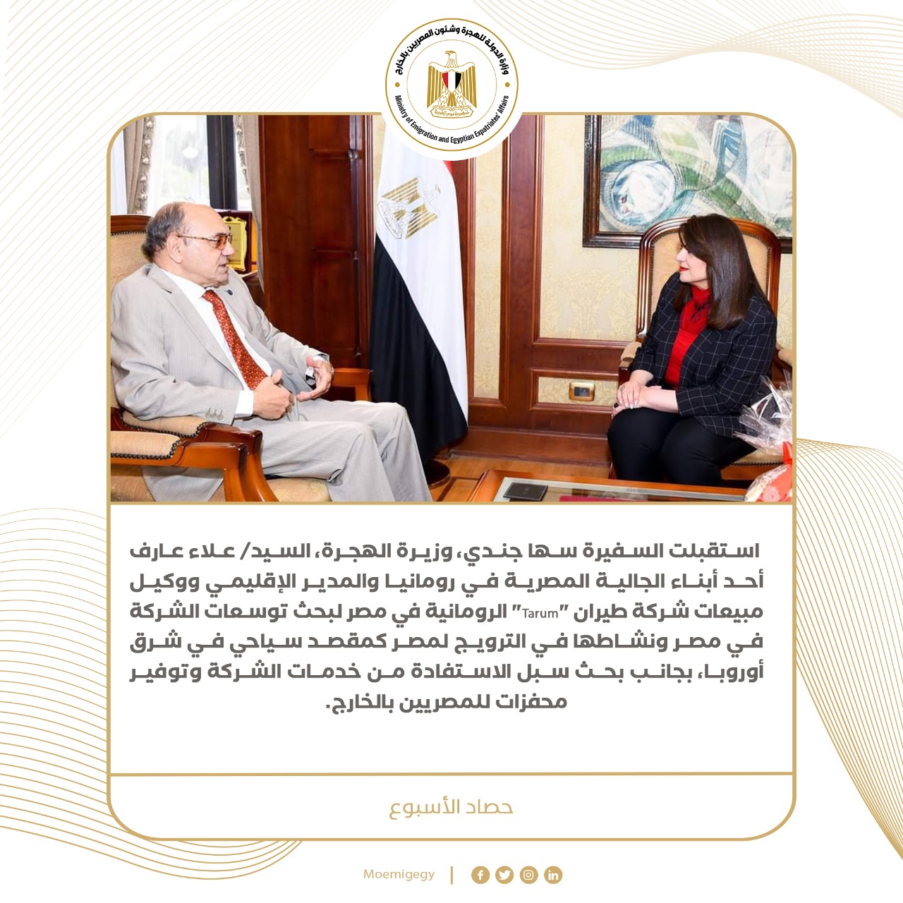 1) استقبلت السفيرة سها جندي، وزيرة الهجرة، علاء عارف أحد أبناء الجالية المصرية في رومانيا والمدير الإقليمي ووكيل مبيعات شركة طيران “Tarum” الرومانية في مصر لبحث توسعات الشركة في مصر ونشاطها في الترويج لمصر كمقصد سياحي في شرق أوروبا، بجانب بحث سبل الاستفادة من خدمات الشركة وتوفير محفزات للمصريين بالخارج.