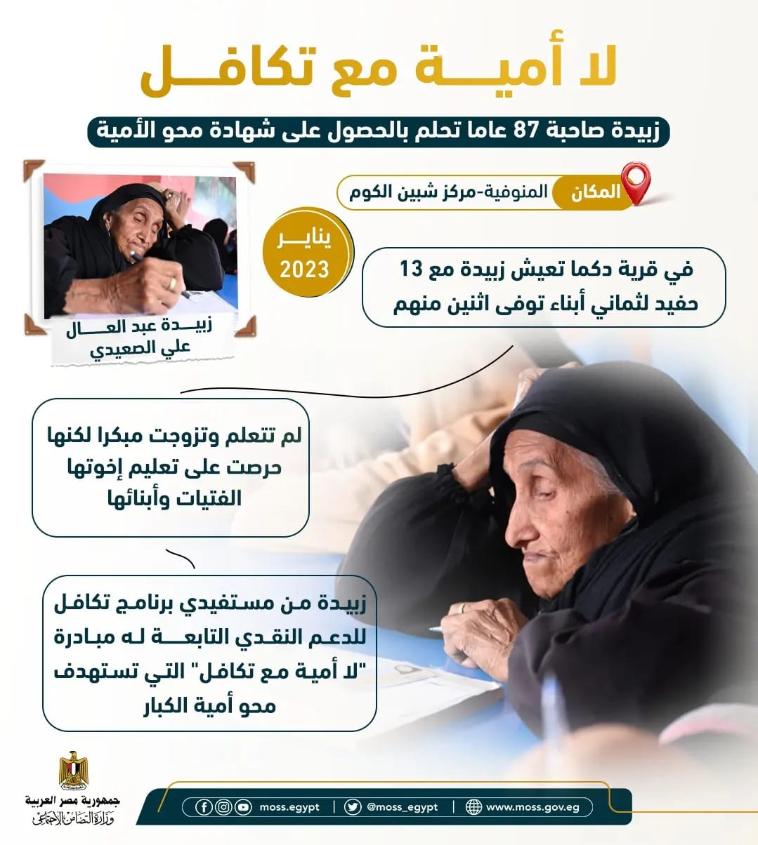 حصلت السيدة زبيدة عبد العال علي الصعيدي من قرية دكما مركز شبين الكوم بمحافظة المنوفية وتبلغ من العمر 87 عامًا، على شهادة محو الامية، في إطار مبادرة «لا أمية مع تكافل» التي تنفذها وزارة التضامن الاجتماعي تحت إشراف نيفين القباج وزيرة التضامن الاجتماعي والتي تستهدف محو أمية أسر برنامج «تكافل».