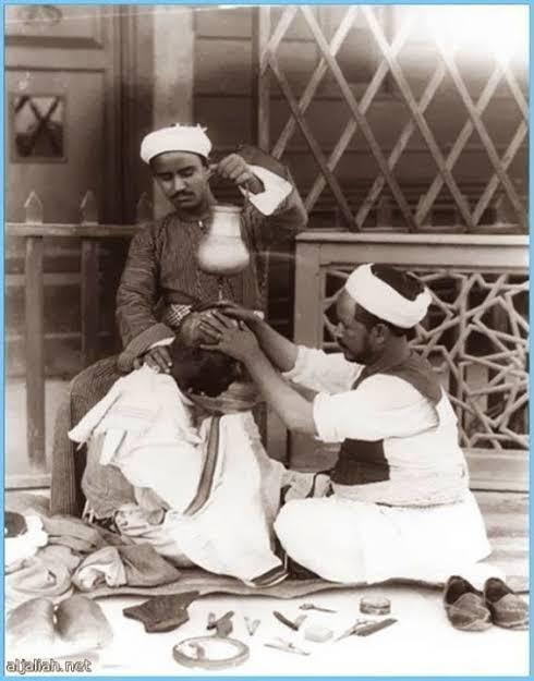 ويحكى أن حلاق الصحة كان يجلس على الطريق العام ويفرد أدواته على منديل أبيض وتنحى له الهامات والرؤوس وكانت الموالد ازهى ايامه حيث يقصده الاهالي لاتمام عمليات الطهارة للاطفال وكان يستخدم ادوات جراحية بسيطه فكان يري الكثير في وصفاته العلاجية الشفاء.