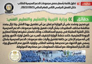 وأشارت إلى أنه سيتم الإعلان عن كل تفاصيل وآليات عقد مجموعات الدعم المدرسية بشكل رسمي فور الانتهاء من تحديدها، مُناشدةً الطلاب وأولياء الأمور عدم الانسياق وراء تلك الأخبار المغلوطة، مع استقاء المعلومات من مصادرها الموثوقة.