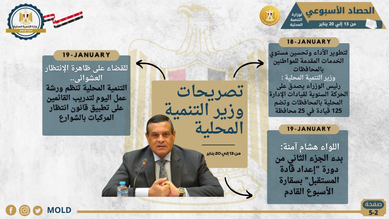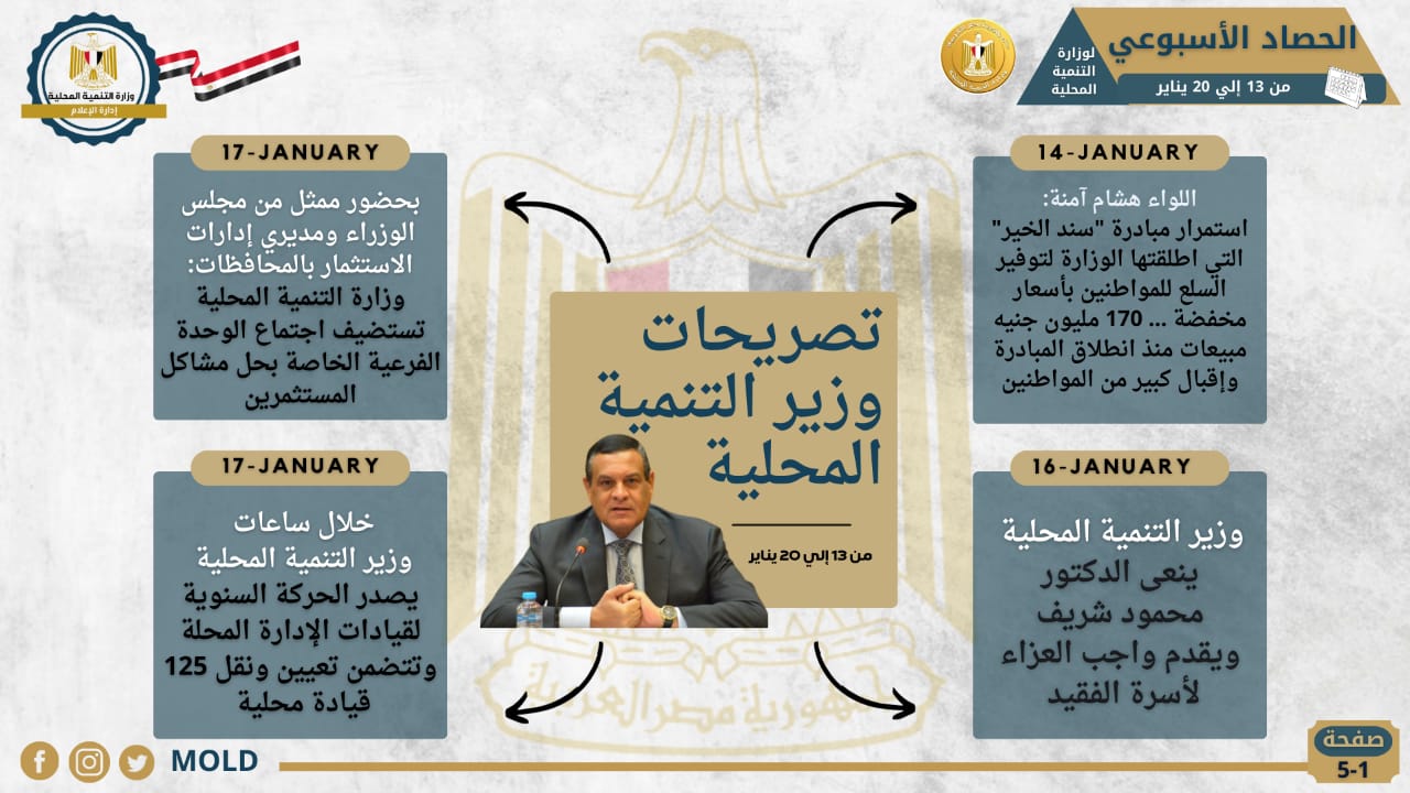 أصدر المركز الإعلامي، التابع لوزارة التنمية المحلية، ” الانفوجراف الأسبوعي” في نسخته الثامنة عشر حول حصاد أهم الأنشطة والفعاليات التي قام بها اللواء هشام آمنة وزير التنمية المحلية، خلال الأسبوع الماضي في الفترة من ١٤ إلي 20 يناير الجاري.