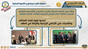 شهد اللواء هشام آمنة وزير التنمية المحلية ، والدكتورة رشا راغب المدير التنفيذي للأكاديمية الوطنية للتدريب ختام فعاليات برنامج المهارات القيادية لرؤساء المدن والمراكز والأحياء بالمحافظات و البرنامج التدريبي لقيادات الإدارة المحلية المعينيين بالإعلان رقم ١ لسنة ٢٠٢١ وذلك بمقر الاكاديمية الوطنية للتدريب بحضور عدد من قيادات الاكاديمية ووزارة التنمية المحلية .
