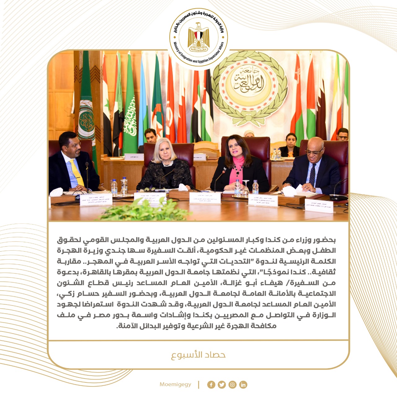 6) بحضور وزراء من كندا وكبار المسئولين من الدول العربية والمجلس القومي لحقوق الطفل وبعض المنظمات غير الحكومية، ألقت السفيرة سها جندي وزيرة الهجرة الكلمة الرئيسية لندوة “التحديات التي تواجه الأسر العربية في المهجر.. مقاربة ثقافية.. كندا نموذجًا”، التي نظمتها جامعة الدول العربية بمقرها بالقاهرة، بدعوة من السفيرة/ هيفاء أبو غزالة، الأمين العام المساعد رئيس قطاع الشئون الاجتماعية بالأمانة العامة لجامعة الدول العربية، وبحضور السفير حسام زكي، الأمين العام المساعد لجامعة الدول العربية، وقد شهدت الندوة استعراضا لجهود الوزارة في التواصل مع المصريين بكندا وإشادات واسعة بدور مصر في ملف مكافحة الهجرة غير الشرعية وتوفير البدائل الآمنة.