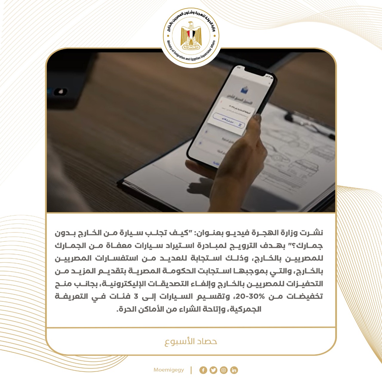 4) نشرت وزارة الهجرة فيديو بعنوان: “كيف تجلب سيارة من الخارج بدون جمارك؟” بهدف الترويج لمبادرة استيراد سيارات معفاة من الجمارك للمصريين بالخارج، وذلك استجابة للعديد من استفسارات المصريين بالخارج، والتي بموجبها استجابت الحكومة المصرية بتقديم المزيد من التحفيزات للمصريين بالخارج وإلغاء التصديقات الإليكترونية، بجانب منح تخفيضات من 20-30%، وتقسيم السيارات إلى 3 فئات في التعريفة الجمركية، وإتاحة الشراء من الأماكن الحرة.