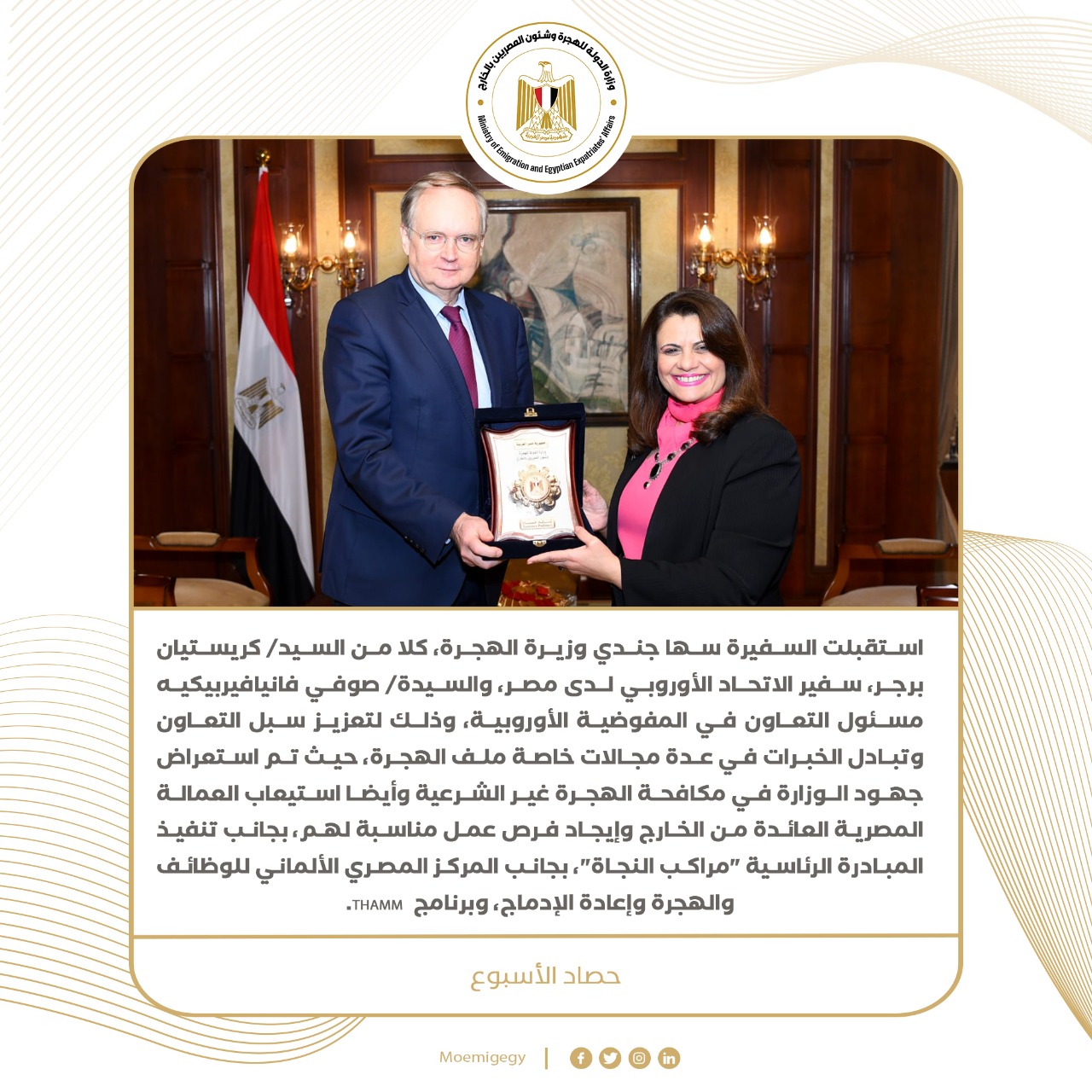 3) استقبلت السفيرة سها جندي وزيرة الهجرة، كلا من كريستيان برجر، سفير الاتحاد الأوروبي لدى مصر، وصوفي فانيافيربيكيه مسئول التعاون في المفوضية الأوروبية، وذلك لتعزيز سبل التعاون وتبادل الخبرات في عدة مجالات خاصة ملف الهجرة، حيث تم استعراض جهود الوزارة في مكافحة الهجرة غير الشرعية وأيضا استيعاب العمالة المصرية العائدة من الخارج وإيجاد فرص عمل مناسبة لهم، بجانب تنفيذ المبادرة الرئاسية “مراكب النجاة”، بجانب المركز المصري الألماني للوظائف والهجرة وإعادة الإدماج،