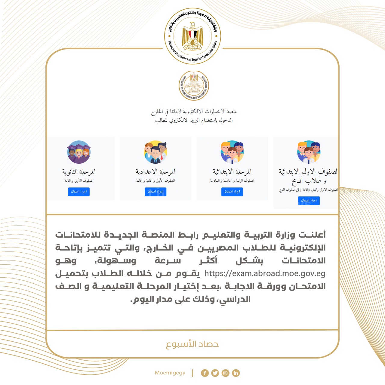 2) أعلنت وزارة التربية والتعليم رابط المنصة الجديدة للامتحانات الإلكترونية للطلاب المصريين في الخارج، والتي تتميز بإتاحة الامتحانات بشكل أكثر سرعة وسهولة، وهو exam.abroad.moe.gov.eg يقوم من خلاله الطلاب بتحميل الامتحان وورقة الاجابة ،بعد إختيار المرحلة التعليمية والصف الدراسي.
