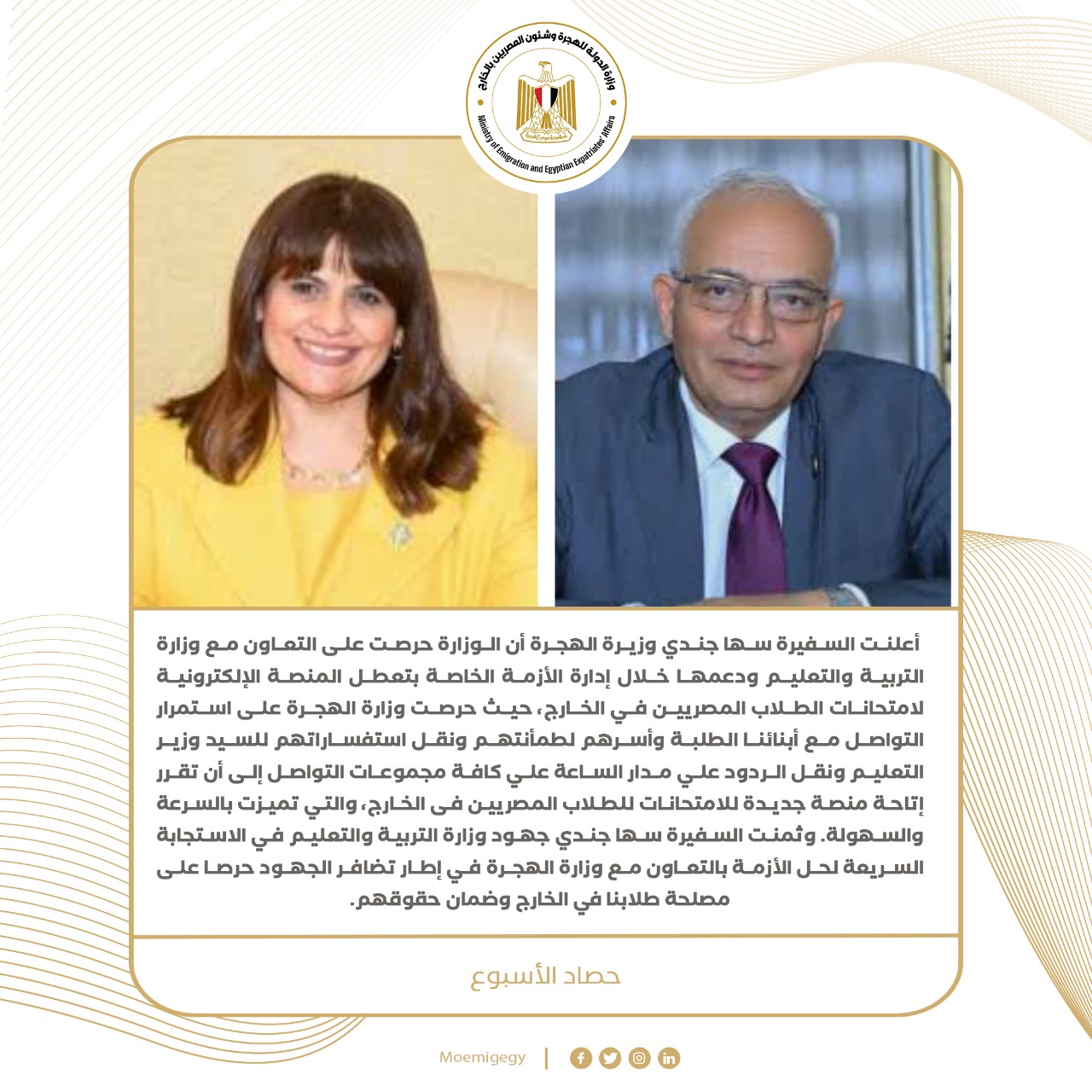 1) أعلنت السفيرة سها جندي وزيرة الهجرة أن الوزارة حرصت على التعاون مع وزارة التربية والتعليم ودعمها خلال إدارة الأزمة الخاصة بتعطل المنصة الإلكترونية لامتحانات الطلاب المصريين في الخارج، حيث حرصت وزارة الهجرة على استمرار التواصل مع أبنائنا الطلبة وأسرهم لطمأنتهم ونقل استفساراتهم للسيد وزير التعليم ونقل الردود علي مدار الساعة علي كافة مجموعات التواصل إلى أن تقرر إتاحة منصة جديدة للامتحانات للطلاب المصريين فى الخارج، والتي تميزت بالسرعة والسهولة. وثمنت السفيرة سها جندي جهود وزارة التربية والتعليم في الاستجابة السريعة لحل الأزمة بالتعاون مع وزارة الهجرة في إطار تضافر الجهود حرصا على مصلحة طلابنا في الخارج وضمان حقوقهم.