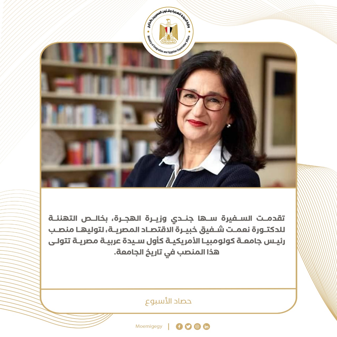 10) تقدمت السفيرة سها جندي وزيرة الهجرة، بخالص التهنئة للدكتورة نعمت شفيق خبيرة الاقتصاد المصرية، لتوليها منصب رئيس جامعة كولومبيا الأمريكية كأول سيدة عربية مصرية تتولى هذا المنصب في تاريخ الجامعة.