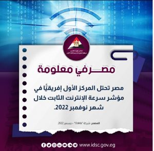وأكد مركز المعلومات ودعم اتخاذ القرار بمجلس الوزراء، على احتلال مصر المركز 84 من بين 180 دولة خلال شهر نوفمبر 2022، كما حصلت على المركز الأول إفريقيًّا في مؤشر سرعة الإنترنت الثابت خلال شهر نوفمبر 2022