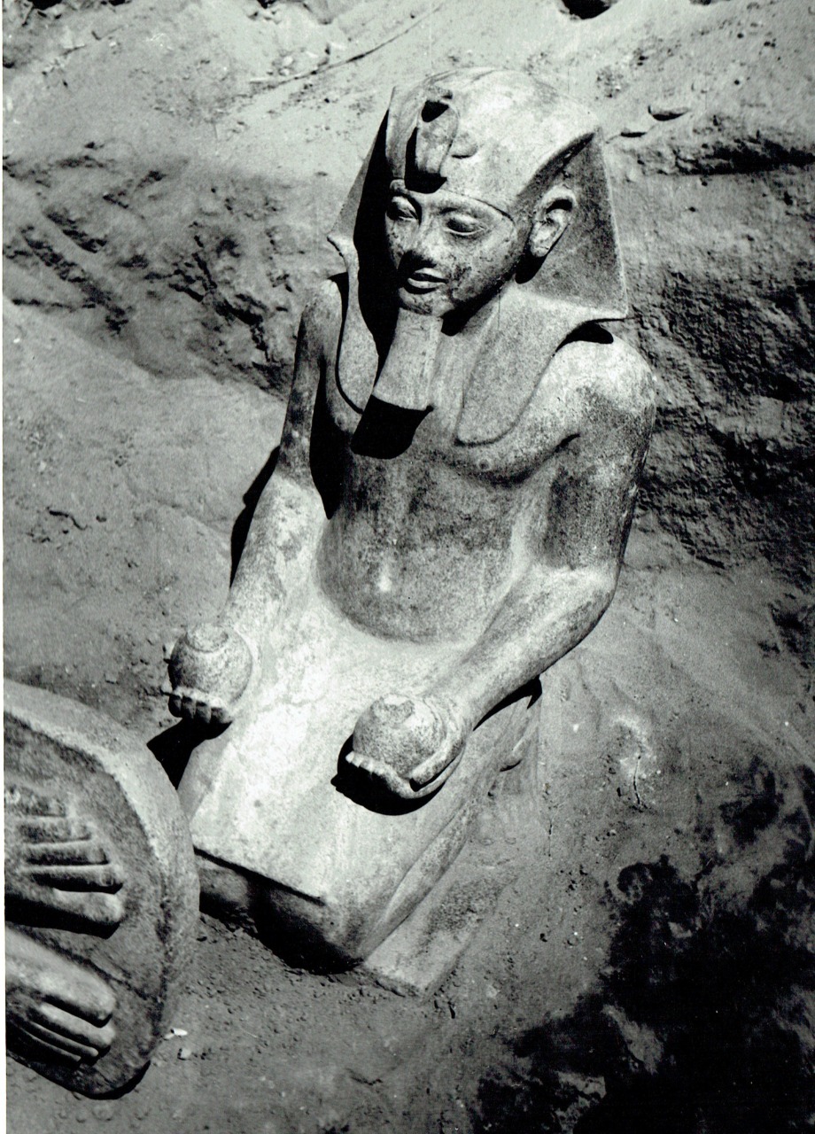 وأثناء أعمال التنظيف ظهرت حافة حجر مصقول من الجرانيت الأشهب على عمق طفيف، والذي اتضح لاحقا أنه قاعدة تمثال بطول 150 سم، ثم توالت الإكتشافات والتي أسفرت عن مجموعة من أروع نماذج فن النحت في مصر القديمة في حالة رائعة من الحفظ صورت عدد من الملوك والمعبودات، ويرجع أغلبها لعصر الدولة الحديثة.