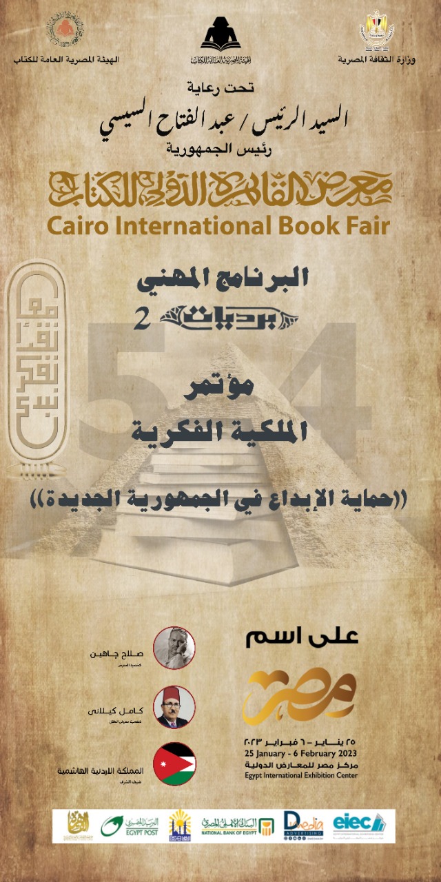 ينظم معرض القاهرة الدولي للكتاب في دورته الـ 54، في العاشرة صباح يوم الخميس 26 يناير، مؤتمرًا للملكية الفكرية تحت شعار «حماية الإبداع في الجمهورية الجديدة»، وهو الأول من نوعه عقب إطلاق الاستراتيجية الوطنية للملكية الفكرية في سبتمبر الماضي، ضمن الفعاليات الثقافية التي تقام على هامش معرض القاهرة في البرنامج المهني «برديات 2».