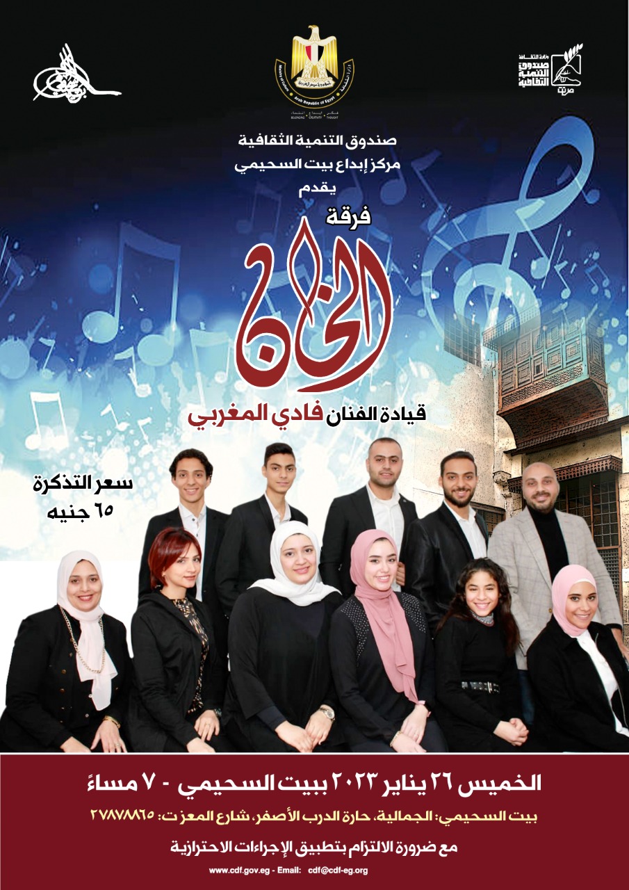 يقيم مركز إبداع بيت السحيمي بشارع المعز، التابع لقطاع صندوق التنمية الثقافية، حفلا موسيقيًا لفرقة “الخان”، وذلك في السابعة مساء الخميس 26 يناير 2023.