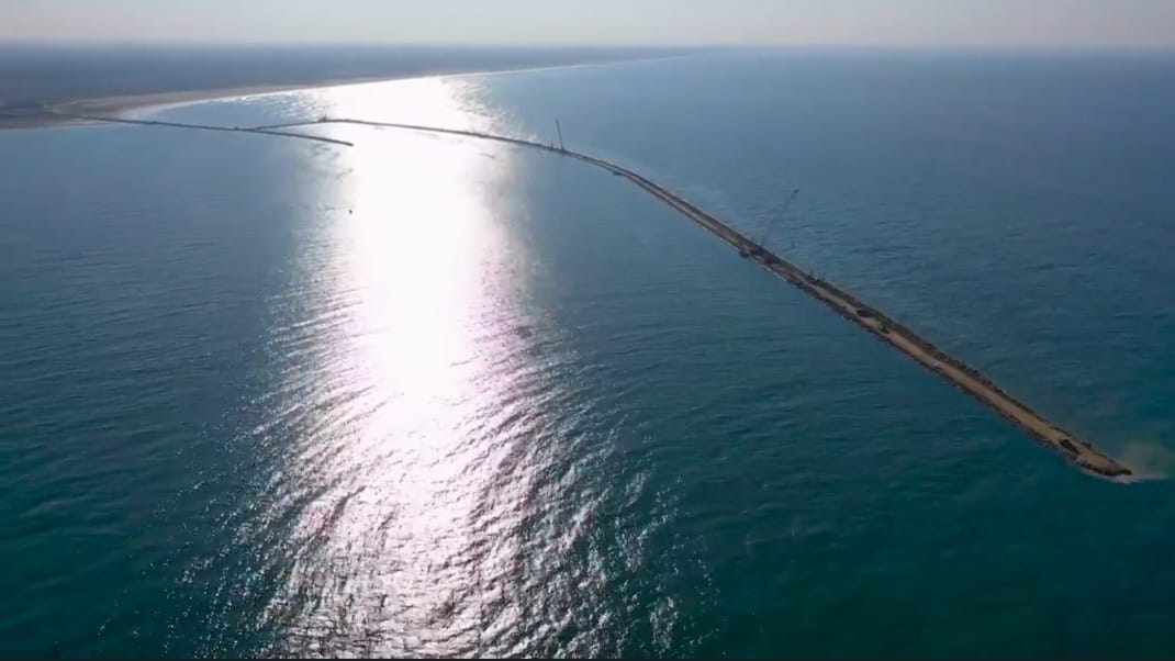 شاهد حاجز الأمواج الغربي الجديد لميناء دمياط بطول أجمالي 5400 متر يقوم بحماية ميناء دمياط من العوامل الجوية المختلفة بالإضافة للمساهمة في تشكيل أرض بمساحة تصل ل 3 مليون م2 لزوم توسعات ميناء دمياط .
