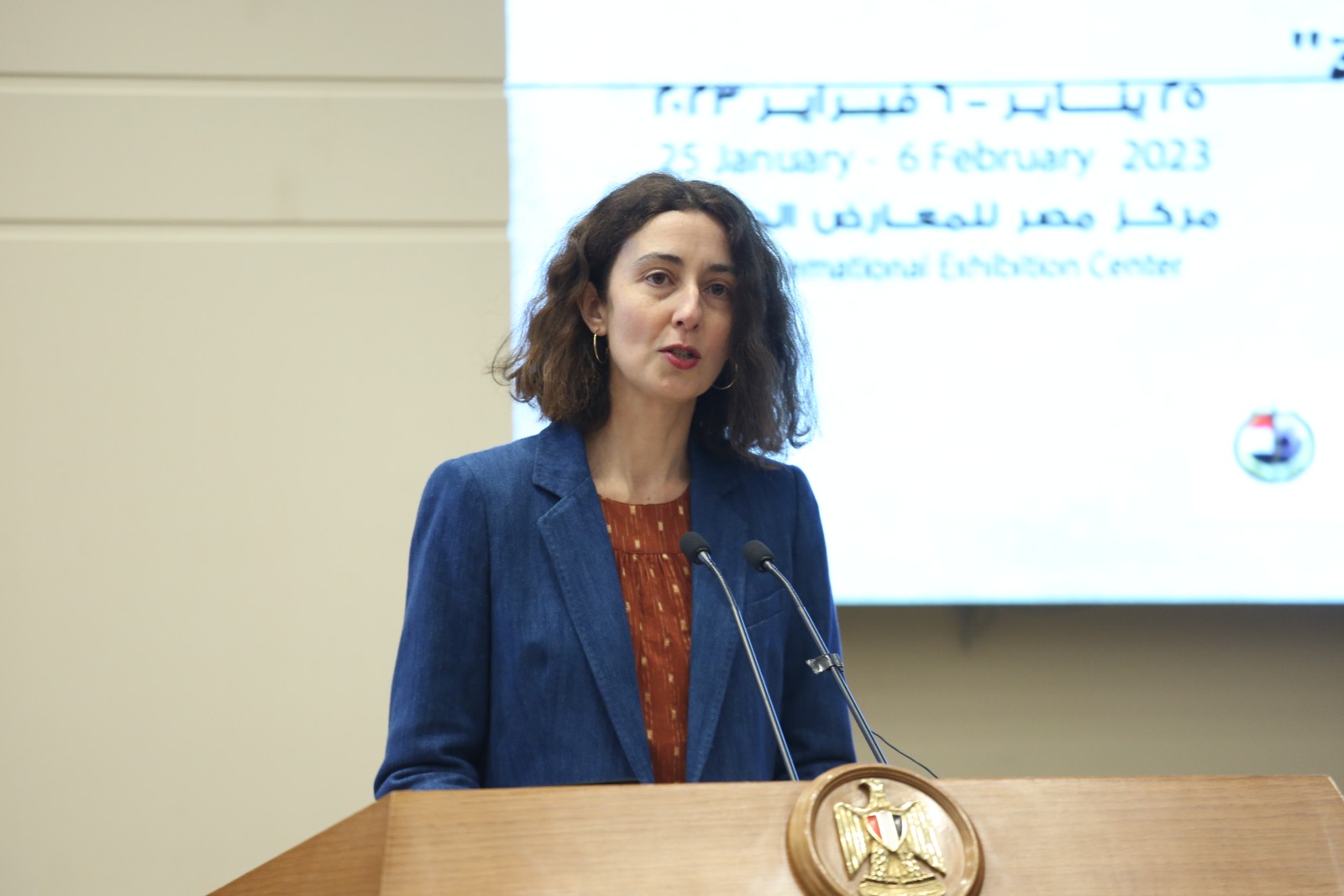 وأوضحت أن مصر ساهمت في إثراء حركة الترجمة، من خلال دعمها لليونسكو في إيصال رسالتها، ففي عام 1948 بدأت اليونسكو بترجمة مجموعة من المختارات الأدبية والفكرية، حيث أسهمت بترجمة 1500 عنوان بالعربية إلى الإنجليزية والفرنسية والإسبانية، والتي فاز بعض كتابها بجوائز نوبل، كما تم ترجمة أعمال طه حسين إلى الفرنسية، الذي كان بداية حركة الترجمة من العربية إلى اللغات الأخرى. وأشارت إلى أن هناك أكثر من 150 مليون شخص يتحدثون العربية حول العالم، ونحن في اليونسكو معجبون باللغة العربية لما لها من أثر جمالي في مفرداتها، ولهذا تم إطلاق جائزة اليونسكو- الشارقة التى تهدف إلى نشر الثقافة العربية إلى العالم، ويعمل اليونسكو على مشروع سوف يضم المترجمين على مستوى العالم، لزيادة الوعي باللغة العربية، من خلال مشروع طريق الحرير، حيث ساهمت اللغة العربية قديمًا في التواصل بين التجار.