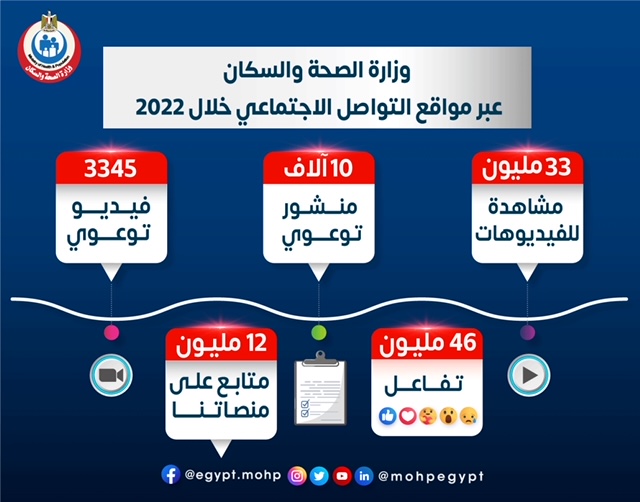 قالت وزارة الصحة والسكان، إن مقاطع الفيديو التوعوية على منصات التواصل الاجتماعي للوزارة، تخطت حاجز الـ33 مليون مشاهدة لـ3345 مقطع فيديو توعوي، تم تداوله عبر منصات الوزارة الموثقة، وذلك خلال العام الماضي 2022.