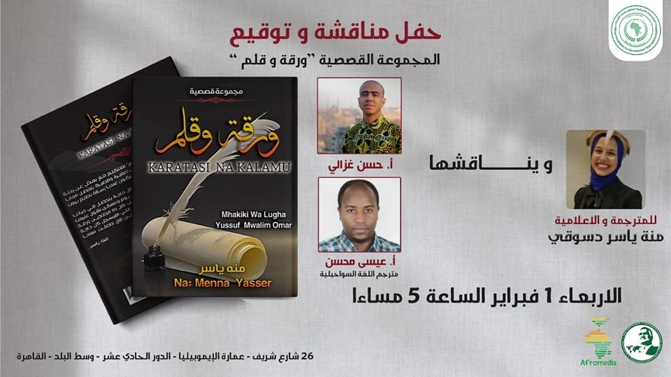 تقيم مبادرة أفروميديا الإعلامية المتخصصين والمهتمين بالشؤون واللغات الأفريقية ٥ مساء اليوم “الأربعاء” حفل مناقشة وتوقيع كتاب «Karatasi Na Kalamu ورقة وقلم» للمترجمة والإعلامية منة ياسر دسوقي، ممثلة بوابة مصر الأن بمنطقة شرق أفريقيا و الباحثة المتخصصة في اللغات الأفريقية.