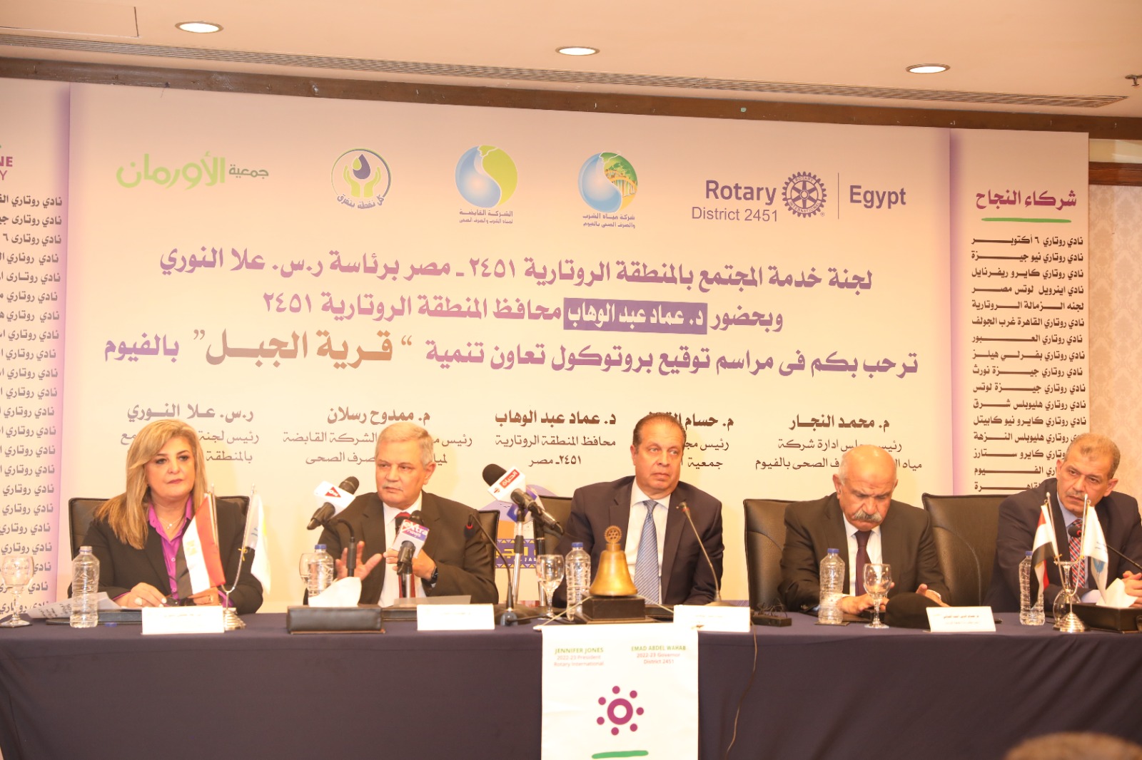شهد المهندس ممدوح رسلان، رئيس الشركة القابضة لمياه الشرب والصرف الصحى، مراسم توقيع بروتوكول تعاون مشترك في مجالات المشاركة المجتمعية، وتوصيل المياه بقرى مركز إطسا بمحافظة الفيوم، لدعم التنمية المتكاملة، وتطوير وتحديث القرى الأكثر احتياجاً بمحافظة الفيوم، ورفع الوعي المائي وتنمية المجتمع بخدمات مياه الشرب، وذلك بين شركة مياه الشرب والصرف الصحي بالفيوم، ويمثلها المهندس محمد عبدالجليل النجار، رئيس الشركة، والاتحاد النوعى للأندية الروتارية بمصر، ويمثله السيدة علا حسين النوري، رئيس لجنة خدمة المجتمع بالمنطقة الروتارية 2451، وبحضور الدكتور عماد عبدالوهاب، محافظ الروتارى، والمهندس حسام الدين أحمد القبانى، رئيس مجلس إدارة جمعية الأورمان.