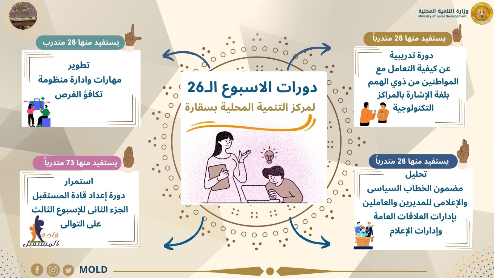 كما يشهد الاسبوع المقبل استمرار دورة “إعداد قادة المستقبل -الجزء الثانى” للأسبوع الثالث علي التوالي ، ويستفيد منها 73 متدرباً ، ويستفيد من دورات الأسبوع القادم 157 متدرب من جميع المحافظات.