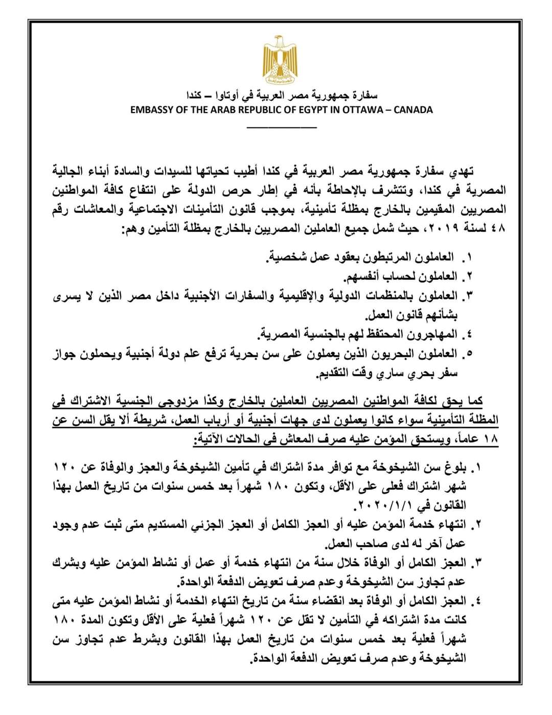 نشرت السفارة المصرية بكندا ،شروط تطبيق قانون التأمينات الإجتماعية ،للمصريين فى أنحاء كندا .