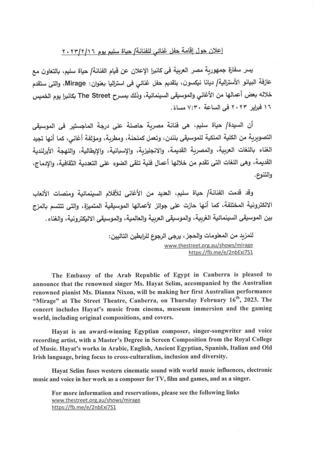 أعلنت السفارة المصرية فى كانبرا، عن حفل غنائي كبير بأستراليا،تحييه الفنانة المصرية حياة سليم ،بالتعاون مع عازفة البيانو الأسترالية ديانا نيكسون،تحت عنون mirage ،وتقدم خلاله اغانى من أعمال وموسيقى سينمائية،يقام الحفل على مسرحthe Street يوم الخميس ١٦ فبراير ٢٠٠٢٤،فى السابعة والنصف مساءً