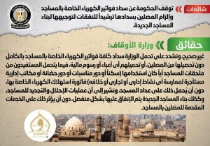 نفى المركز الإعلامي لمجلس الوزراء، ما انتشر في بعض المواقع الإلكترونية وصفحات التواصل الاجتماعي من أنباء بشأن توقف الحكومة عن سداد فواتير الكهرباء الخاصة بالمساجد، وإلزام المصلين بسدادها ترشيداً للنفقات لتوجيهها لبناء المساجد الجديدة.