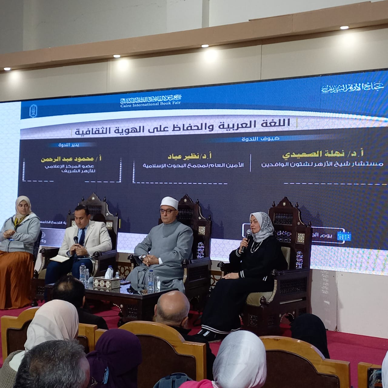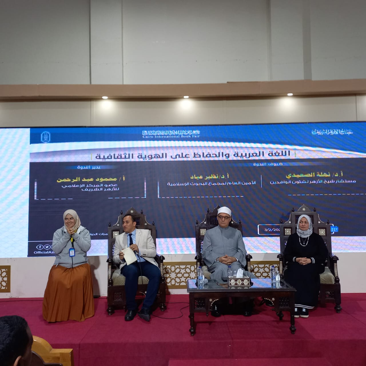 نظم جناح الأزهر الشريف بمعرض القاهرة الدولي للكتاب في نسخته (٥٤)، اليوم الجمعة ، ندوة تثقيفية بعنوان ،”اللغة العربية والحفاظ على الهوية الثقافية”، حاضر فيها الدكتورة نهلة الصعيدي، مستشار شيخ الأزهر لشؤون الوافدين، والدكتور نظير عياد، الأمين العام لمجمع البحوث الإسلامية، وأدار الندوة الإعلامي محمود عبد الرحمن، عضو المركز الإعلامي بالأزهر الشريف، وذلك رغبةً من الأزهرالشريف في تسليط الضوء على دوره في تعزيز انتشار اللغة العربية وإبراز مدى أهميتها ومكانتها للحفاظ على هوية الأمة الإسلامية.