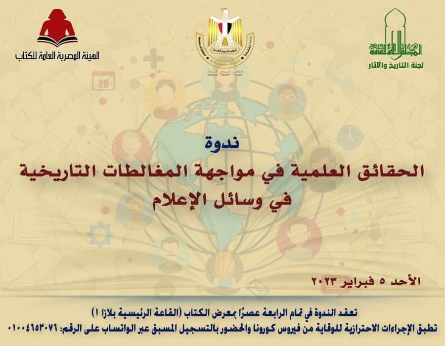 تنظم لجنة التاريخ والاثار بالمجلس الأعلى للثقافة وبالتعاون مع الجمعية المصرية للدراسات التاريخية، ندوة بعنوان ” الحقائق العلمية في مواجهــة المغالطات التاريخية في وسائل الأعلام “، والتي تأتي ضمن سلسلــة ندوات ” نحن والتاريـــخ ” بالتعاون مع الجمعية المصرية للدراسات التاريخيـة خلال الدورة ال45 لمعرض الكتاب الدولى، وذلك غدا الأحد الموافق 5 فبراير الحالي؛ فى تمــام الساعة الرابعة عصرا بالقاعة الرئيسية بلازا 1 بمعرض القاهرة الدولي للكتاب.