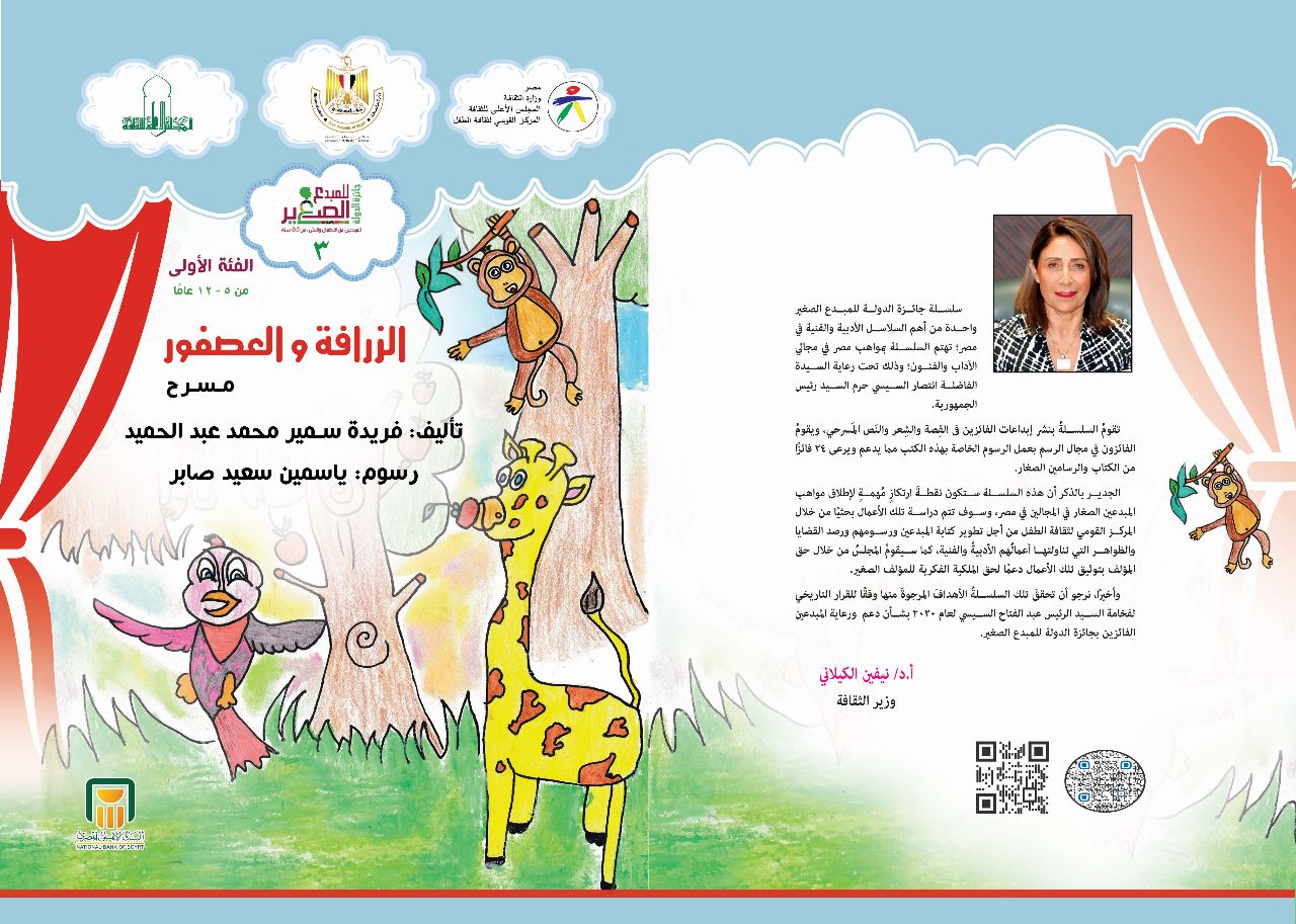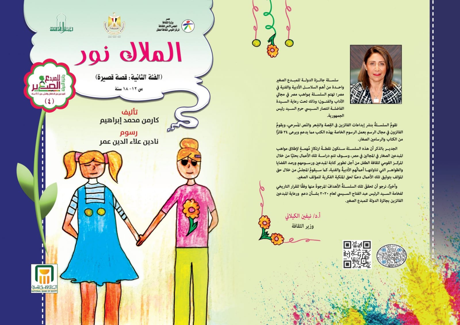 ويقام اليوم في ختام فعاليات المعرض حفل توقيع لأحدث الإصدارات الفائزة في الدورة الثانية وهما كتاب “الملاك نور” وكتاب “الزرافة والعصفور”، والملاك نور قصة قصيرة، تأليف المبدعة الصغيرة كارمن محمد إبراهيم، ورسوم الفنانة المبدعة نادين علاء الدين عمر، الفائزين بجائزة الدولة للمبدع الصغير من الفئة الثانية من سن ١٨:١٢ سنة، وكتاب “الزرافة والعصفور” تأليف المبدعة الصغيرة فريدة سمير محمد عبد الحميد، ورسوم الطفلة ياسمين سعيد صابر، الفائزين بجائزة الدولة للمبدع الصغير من الفئة الأولى من سن ١٢:٥ سنة.