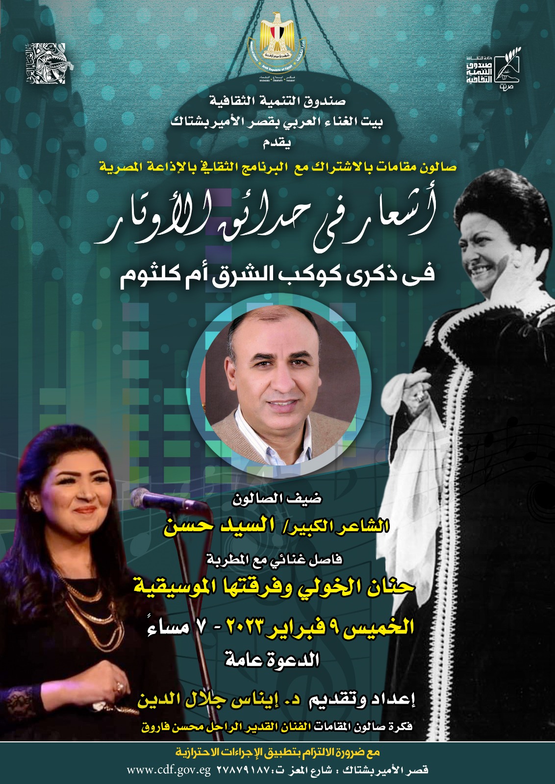 يحيى “صالون مقامات” مساء الخميس 9 فبراير الجارى ذكرى رحيل سيدة الغناء العربى “أم كلثوم” ببيت الغناء العربى “بقصر الأمير بشتاك” بشارع المعز، التابع لقطاع صندوق التنمية الثقافية، والذى يقام هذا الشهر تحت عنوان “أشعار فى حدائق الأوتار”، بالاشتراك مع البرنامج الثقافى بالإذاعة المصرية.