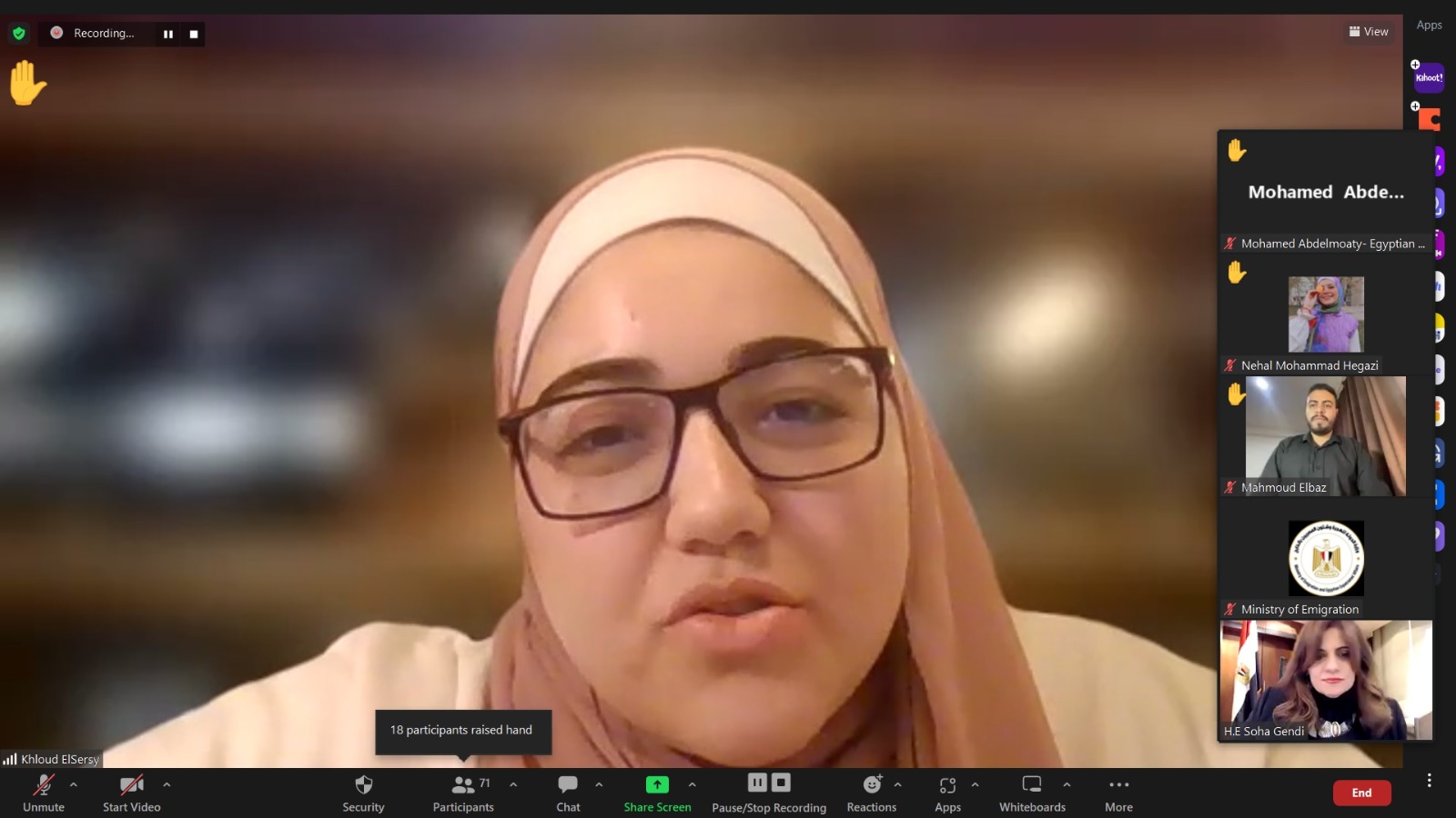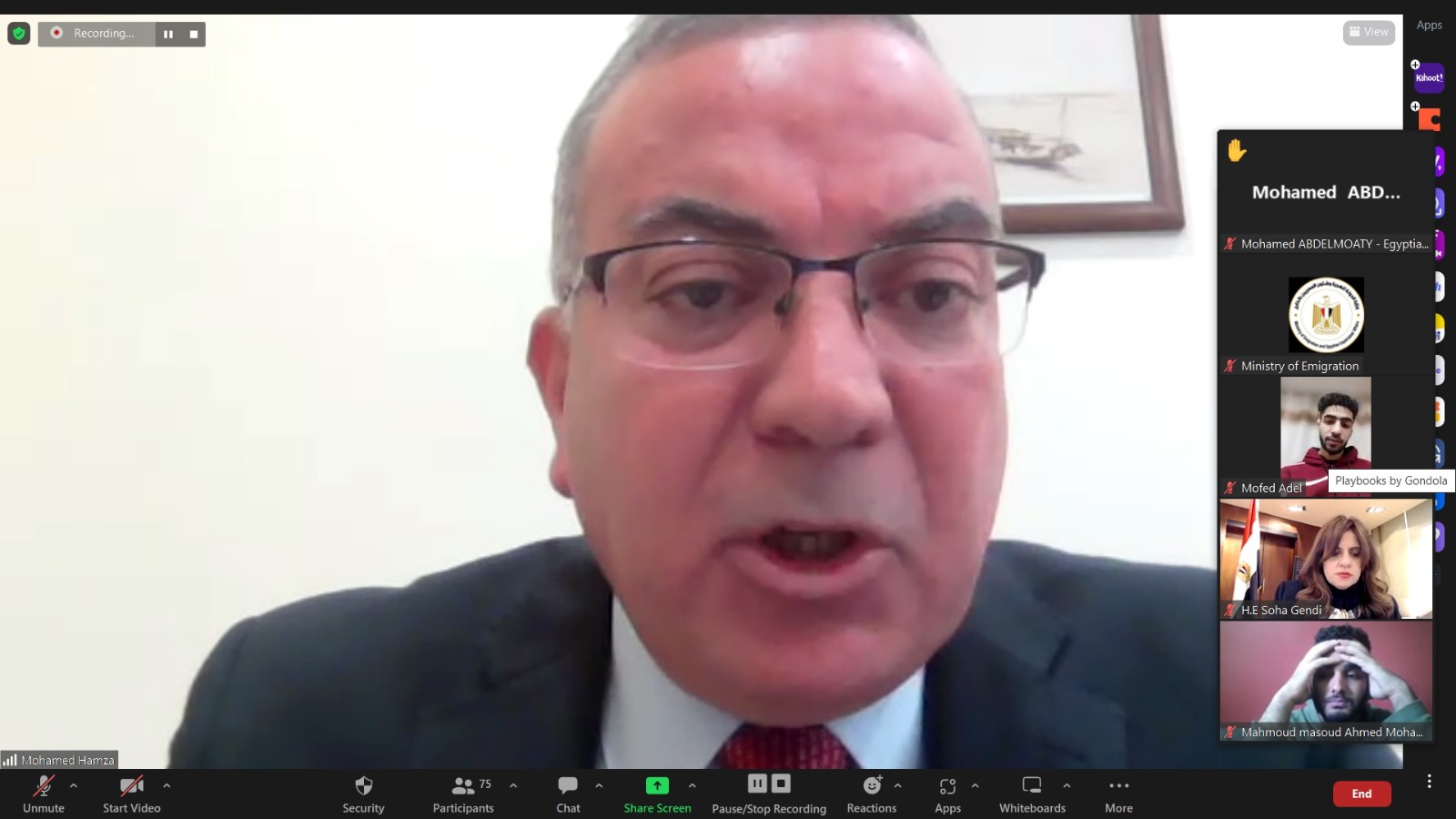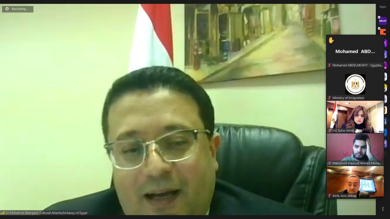 وتطرقت السفيرة سها جندي إلى أنه وللحفاظ على الهوية المصرية لدى ابنائنا بالخارج و عملت وزارة الهجرة على تنفيذ العديد من المعسكرات الشبابية والزيارات والملتقيات والفعاليات المختلفة لأبناء الجيلين الثاني والثالث ليلمسوا بأنفسهم ما يجري على أرض الواقع من تقدم، هذا بالإضافة إلى إطلاق الوزارة المبادرة الرئاسية “اتكلم عربي” والتي تستهدف بالأساس الحفاظ على الهوية المصرية، مشيرة إلى انه يتم حاليا العمل على اطلاق عدد من الفيديوهات في اطار المبادرة لتوعية وتثقيف ابنائنا بالخارج والحفاظ على هويتهم المصرية.
