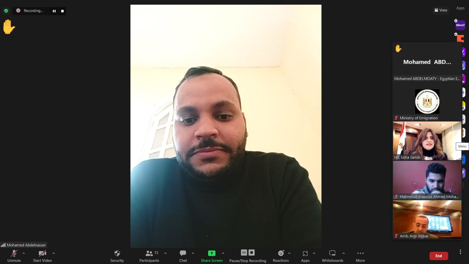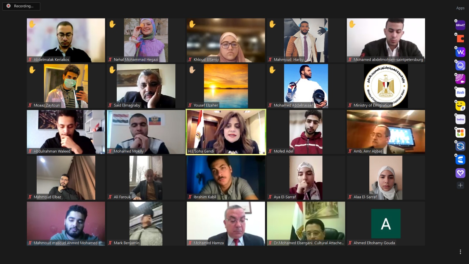 كما شارك في اللقاء الدكتور محمد السرجاني الملحق الثقافي المصري في روسيا، وممثلي الجالية ومركز وزارة الهجرة للحوار لشباب الدارسين بالخارج، وبحضور الأستاذة نيرمين كمال وكيل محافظ مساعد – قطاع الرقابة و الإشراف ممثلة عن البنك المركزي، و اللواء إيهاب الحيني، ممثلاً عن مصلحة الأحوال المدنية، وعقيد محمد شرشر، مدير إدارة الشئون القانونية بالإدارة العامة للجوازات والهجرة والجنسية بوزارة الداخلية، بالإضافة إلى مشاركة أشرف عطية، ممثلاً عن الهيئة العامة للتأمين الاجتماعي، ودكتورة إلهام فتحي، مدير إدارة أبناؤنا في الخارج ، ممثلة عن وزارة التربية والتعليم، والدكتور محمد حمزة رئيس قطاع الشئون الثقافية والبعثات ممثل عن وزارة التعليم العالي، وذلك للرد على استفسارات المصريين بالخارج.