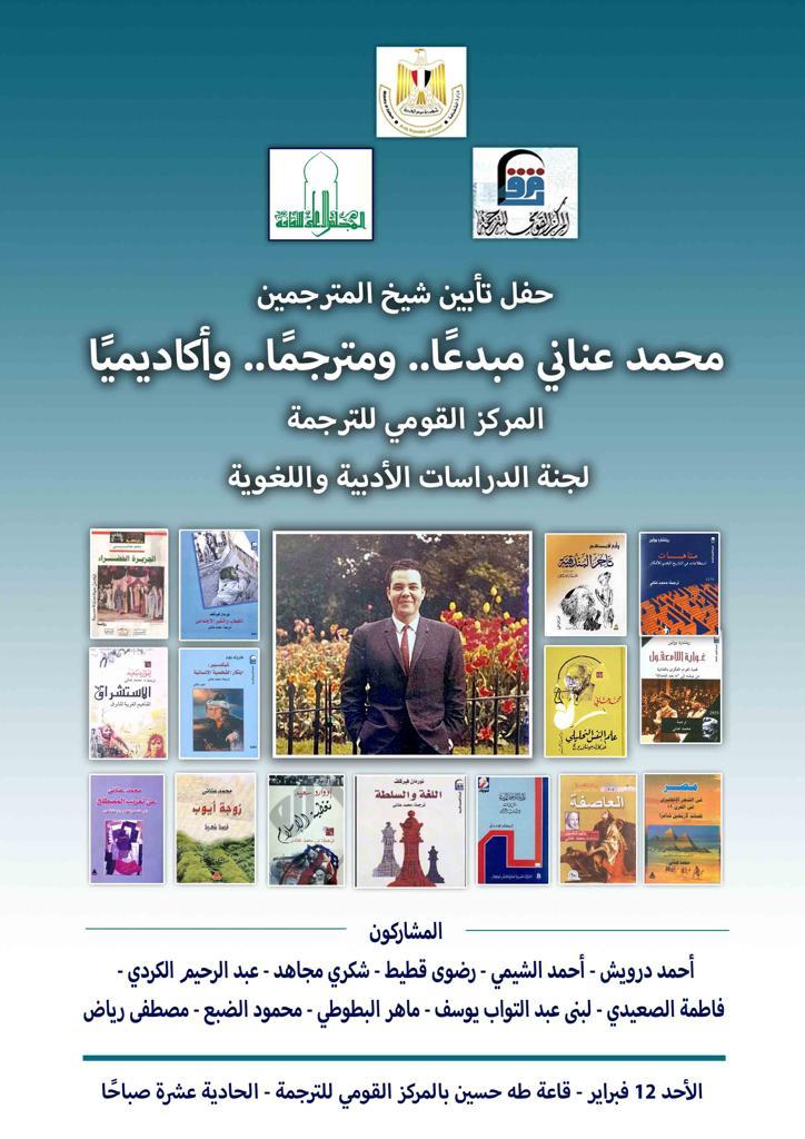 يقيم المركز القومي للترجمة برئاسة الدكتورة كرمة سامي حفل تأبين عميد المترجمين محمد عناني بالتعاون مع لجنة الدراسات الأدبية واللغوية بالمجلس الأعلى للثقافة وذلك في الحادية عشر من صباح الأحد الموافق 12فبراير الجاري بقاعة طه حسين بالمركز القومي للترجمة«محمد عناني مبدعًا.. ومترجمًا.. وأكاديميًا.. وإنسانًا».