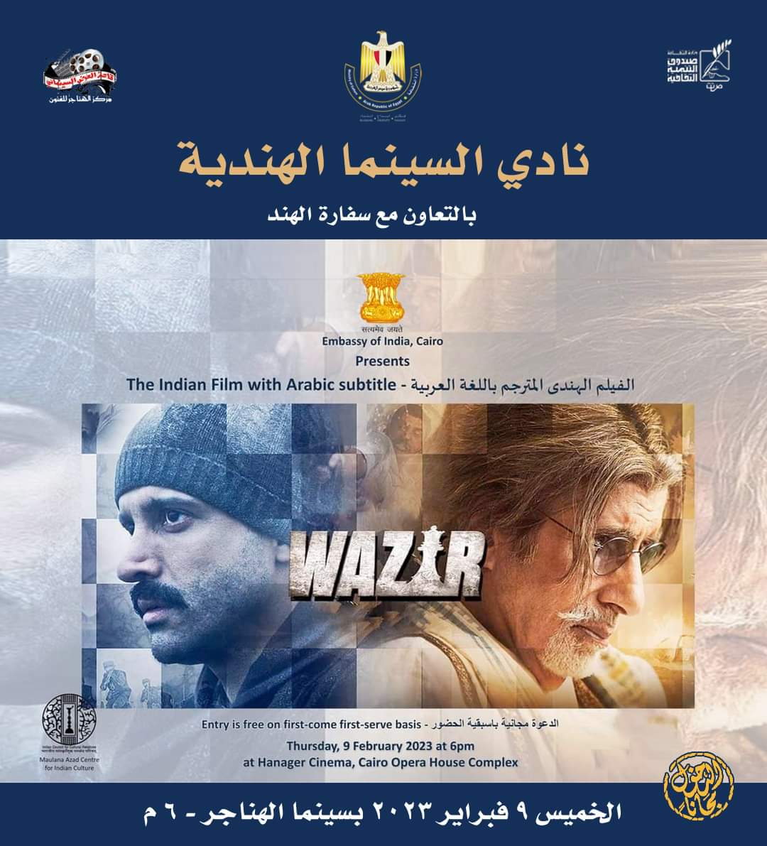 تستضيف سينما الهناجر بساحة الأوبرا التابعة لقطاع صندوق التنمية الثقافية، في السادسة مساء الخميس 9 فبراير الجاري، نادى السينما الهندية، وذلك بالتعاون مع مركز “مولانا آزاد” الثقافى، وسفارة الهند بالقاهرة، بعرض هذا الشهر لفيلم “وزير”.