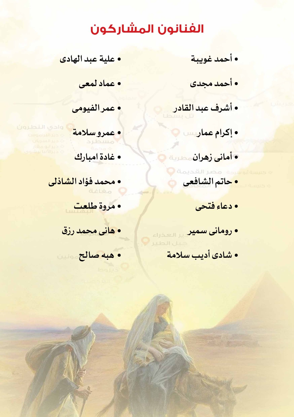 يقدم الفنانون المشاركون ٣٠ عملاً من النحت والتصوير الزيتى والاكريليك والباستل يصور رحلة العائلة المقدسة، وهم: أحمد غويبة، أحمد مجدي، اشرف عبد القادر، إكرام عمار، أماني زهران، حاتم الشافعي، دعاء فتحي، روماني سمير، شادي أديب سلامة، علية عبد الهادي، عماد لمعي، عمر الفيومي، عمرو سلامة، غادة امبارك، محمد فؤاد الشاذلي، مروة طلعت، هاني محمد رزق، هبة صالح، ويعد المعرض الفنانة الدكتورة نجاة فاروق المشرف على إدارة الفنون التشكيلية بالصندوق.