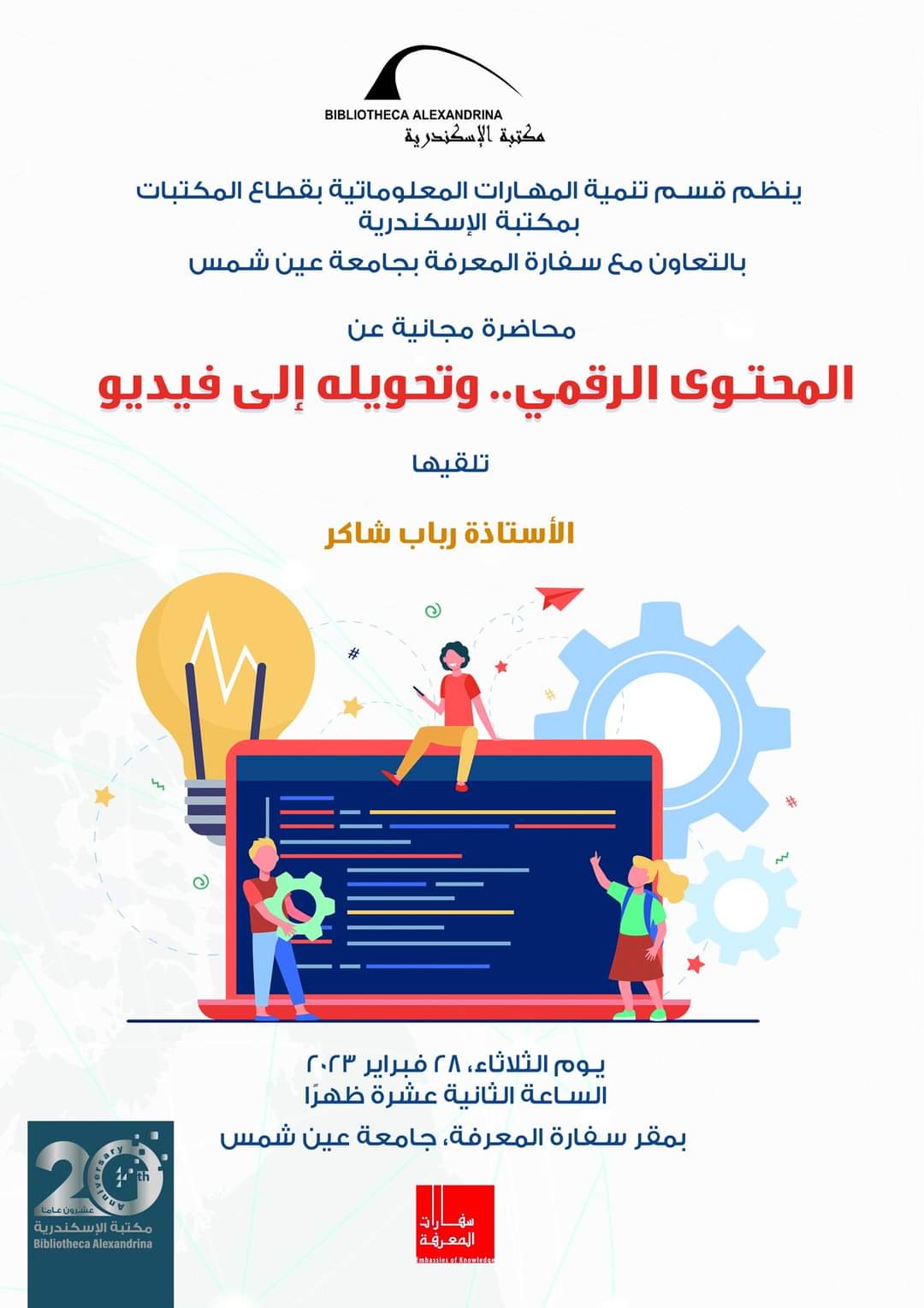 تعلن مكتبة الإسكندرية من خلال قسم تنمية المهارات المعلوماتية بالتعاون مع سفارة المعرفة بجامعة عين شمس عن إقامة ورشتي عمل تدريبية ، يوم الثلاثاء، 28 فبراير 2023، بمقر سفارة المعرفة، جامعة عين شمس الورشة الأولى”المحتوى الرقمي وكيفية تحويله إلى فيديوتقديم رباب شاكرتتناول المحاضرة التعريف بالمحتوى الرقمي وكيفية تحويل المحتوى غير رقمي – قائم – إلى محتوى رقمي.
