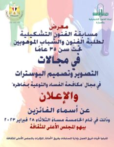 أعلن المجلس الأعلى للثقافة افتتاح معرض مسابقة الفنون التشكيلية لطلبة الفنون والشباب الموهوبين تحت سن ٣٥ عام في مجالات التصوير وتصميم البوسترات، في مجال “مكافحة الفساد والتوعية بمخاطره”، والإعلان عن أسماء الفائزين في المسابقة التي نظمتها لجنة الفنون التشكيلية، وذلك تحت رعاية الدكتورة نيفين الكيلاني وزيرة الثقافة؛ والدكتور هشام عزمي الأمين العام للمجلس الأعلى للثقافة.
