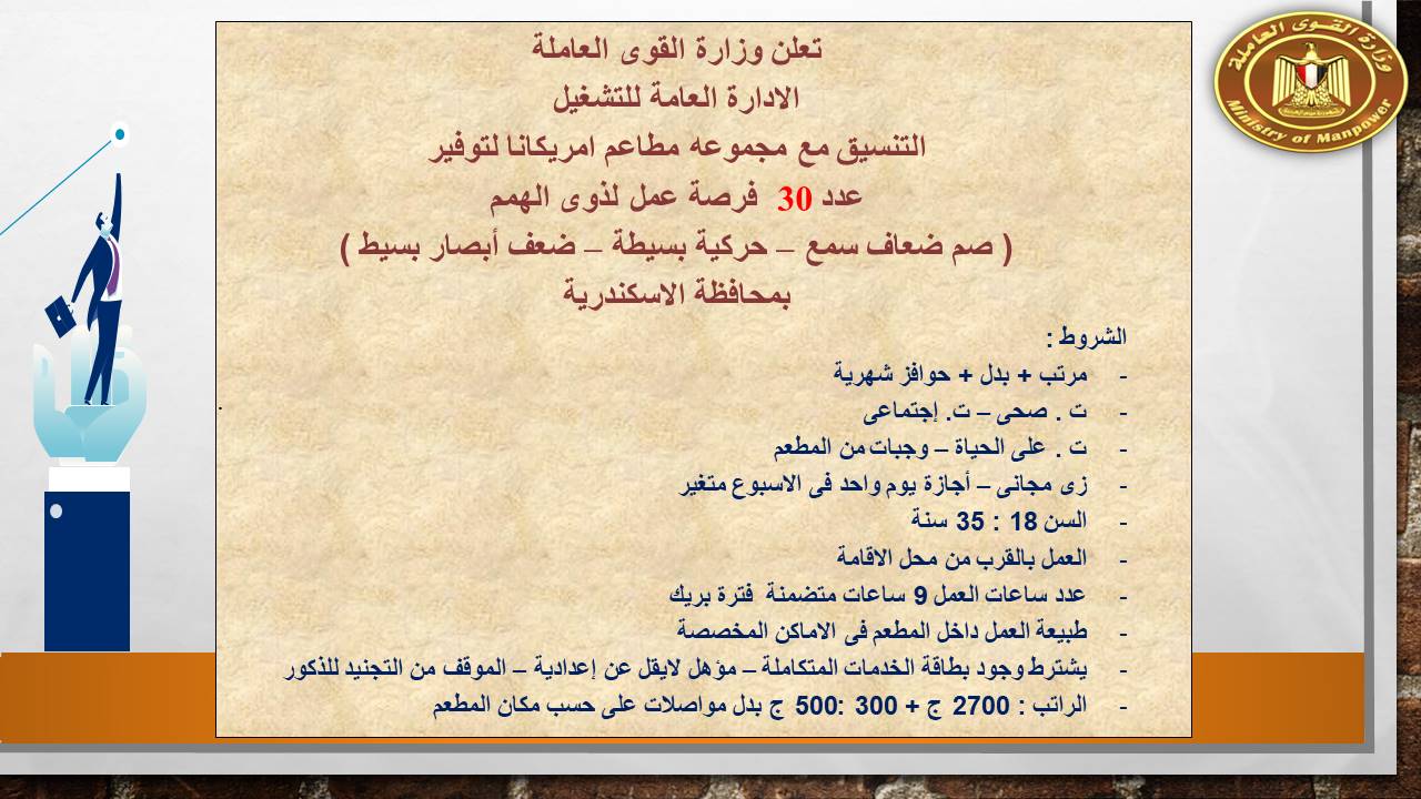 أعلنت وزارة القوى العاملة عن فرص عمل جديدة لذوي همم في محافظتى القاهرة والإسكندرية ..وقال بيان صحفي عن “الوزارة” اليوم الإثنين ان الوزير حسن شحاتة تلقى تقريراً من مديرية القوى العاملة بمحافظتى القاهرة والإسكندرية ، بشأن إستلامها طلباً من مجموعة مطاعم امريكانا ،توضح فيه “المديريتين” ، عن إحتياجها لـ 180 فرصة عمل للأشخاص من ذوي الاعاقة، و”الصم والبكم والحركية البسيطة وضعف الابصار ” من أبناء محافظة القاهرة والإسكندرية وذلك بما يتناسب مع متطلبات العمل داخل الشركتين.