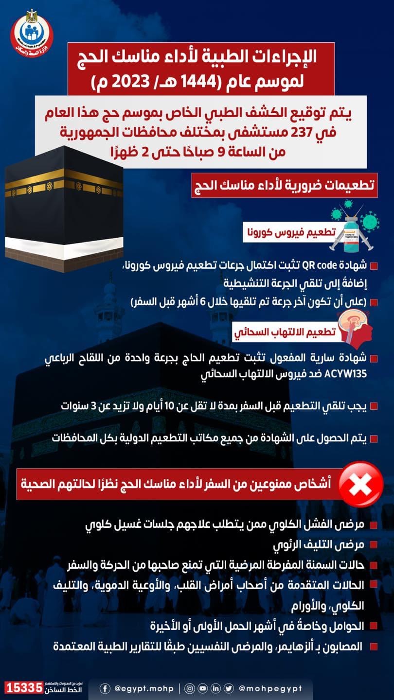 كشفت وزارة الصحة والسكان، التطعيمات اللازمة للحجاج ضمن الإجراءات الطبية لأداء مناسك الحج لموسم عام 2023، حيث تتضمن التطعيمات الضرورية لأداء مناسك الحج تطعيم فيروس كورونا والالتهاب السحائى والأنفلونزا الموسمية.