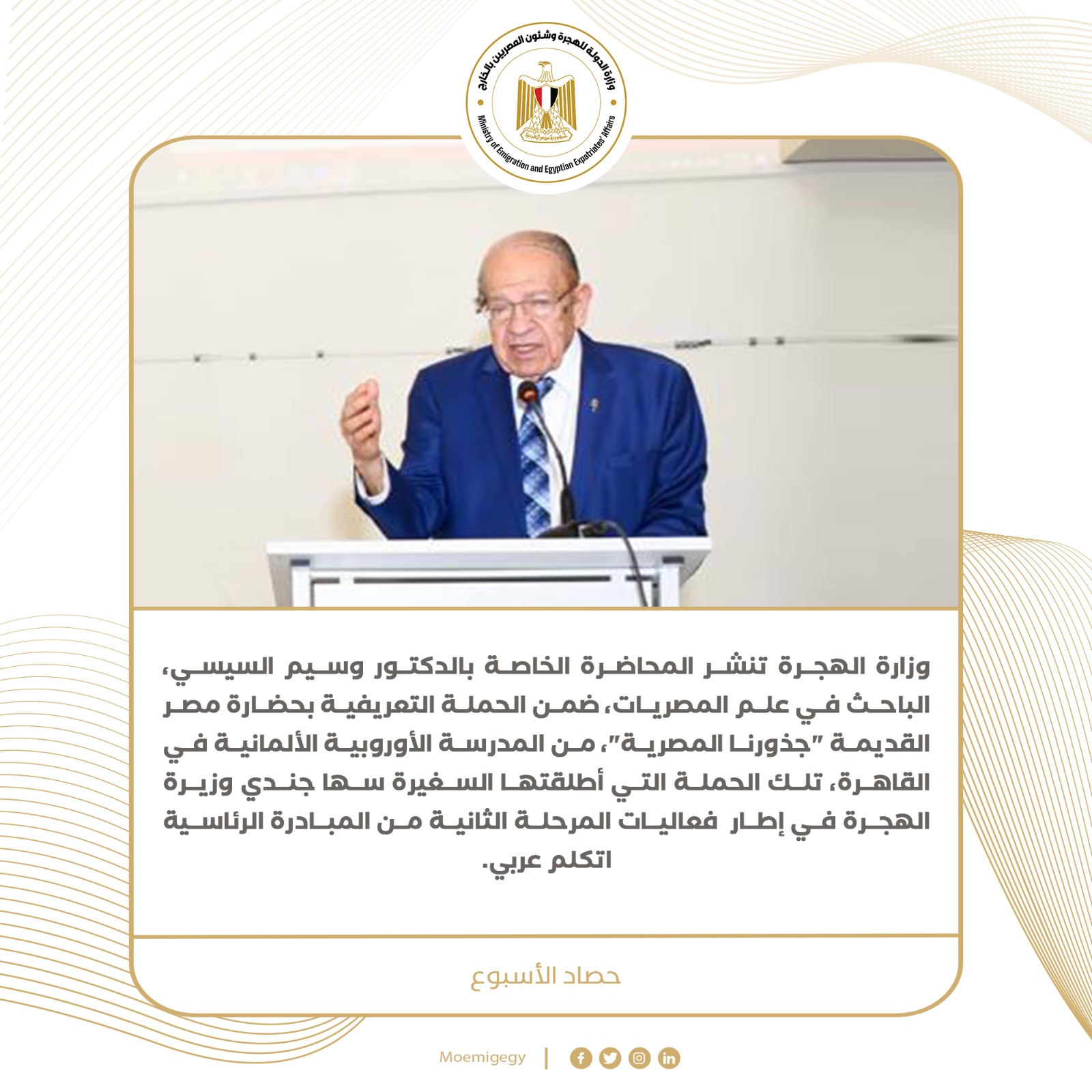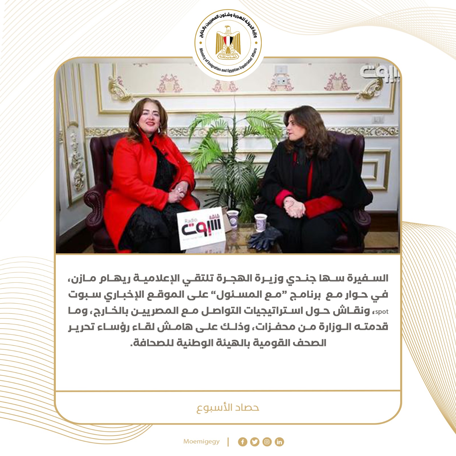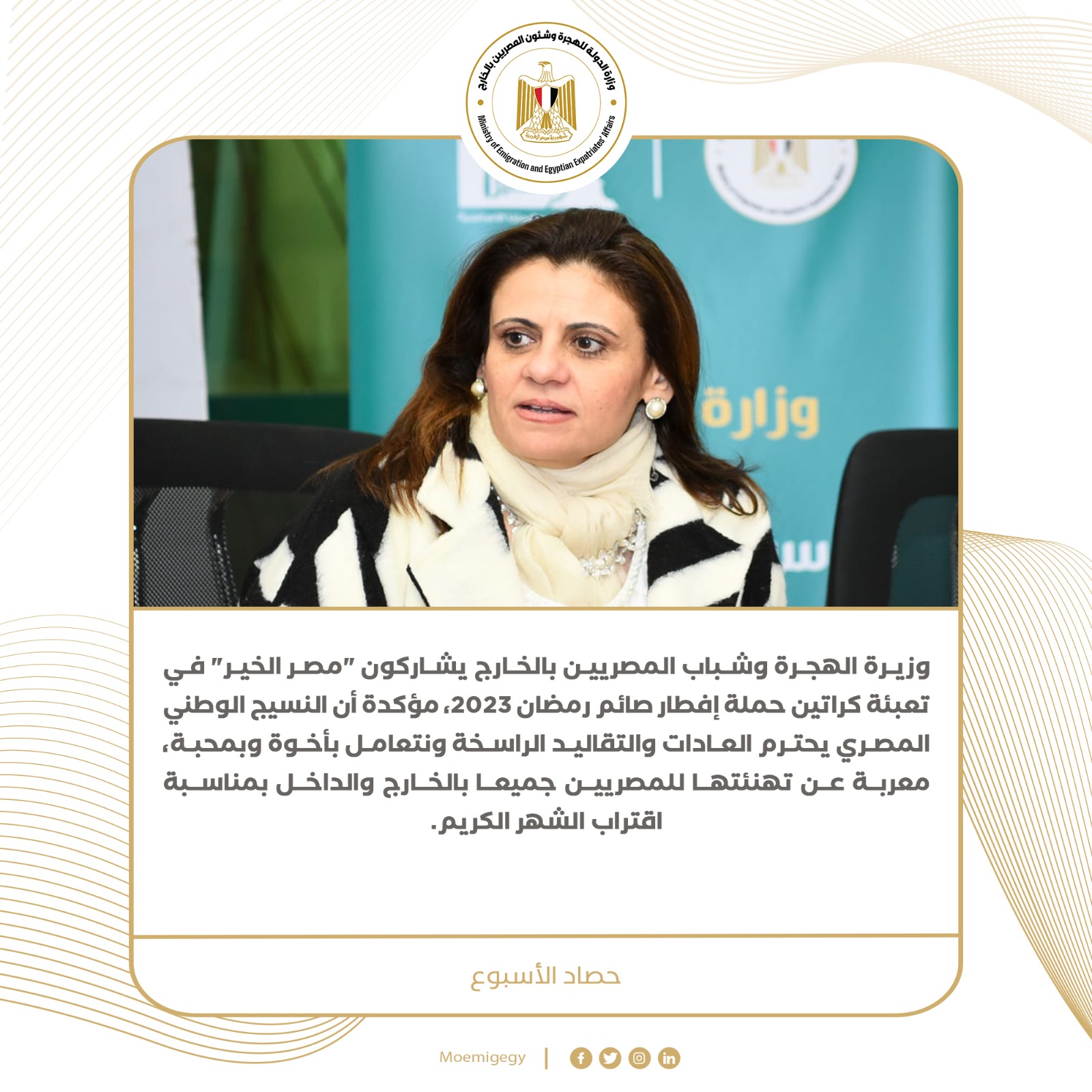 حيث استعرضت مختلف المحفزات المقدمة للمصريين بالخارج، وتناول اللقاء نقاشا مفتوحا حول أبرز المشكلات التي تواجههم، للعمل على حلها، بالتعاون مع وزارات ومؤسسات الدولة المعنية، كما ناقشت وزيرة الهجرة أبرز فرص الاستثمار في مصر وخطط إطلاق شركة متخصصة لاستثمارات المصريين بالخارج وزيرة الهجرة وشباب المصريين بالخارج يشاركون “مصر الخير” في تعبئة كراتين حملة إفطار صائم رمضان 2023، مؤكدة أن النسيج الوطني المصري يحترم العادات والتقاليد الراسخة ونتعامل بأخوة وبمحبة، معربة عن تهنئتها للمصريين جميعا بالخارج والداخل بمناسبة اقتراب الشهر الكريم.وزيرة الهجرة تشيد بجهود وزارة الصحة المصرية في متابعة حالة المصري العائد من موزمبيق “أحمد عبد الفتاح” مؤكدة أن تعافيه وخروجه من الرعاية المركزة بعد نحو 5 أشهر يمثل معجزة، حيث حرصت على زيارته بمستشفى دار الشفاء وتهنئته وأهله بتحسن حالته.وزيرة الهجرة تنعى رجل الأعمال المصرى الكيميائي لويس بشارة رائد صناعة الملابس الجاهزة ومؤسس أول علامات تجارية مصرية للأزياء ورئيس مؤسسة آمال بشارة للتعليم الفنى والتكنولوجى، الذي وافته المنية عن عمر يناهز 84 سنة، قائلة: “قيمة وطنية مهمة في مجال الصناعة، أدعو الله أن يلهم أهله وذويه الصبر والسلوان”تعديلات قانون سيارات المصريين بالخارج تلاقي إشادات كبيرة من المصريين بالخارج، حيث حرصت الحكومة المصرية على الاستجابة لمطالبهم وإجراء تعديلات مهمة لتقديم مختلف التيسيرات الممكنة.وزيرة الهجرة تفتتح الملتقي السنوي الثالث عشر للمسؤلية المجتمعية وعلاقتها بأهداف التنمية المستدامة وتلقي الكلمة الرئيسية، تحت عنوان “التكامل بين أطر إعداد تقارير الاستدامة”، مؤكدة جهود خلق مناخ تنموي مستدام لمواجهة الهجرة غير الشرعية، حيث استعرضت جهود الوزارة في برامج التدريب والتأهيل لسوق العمل وريادة الأعمالالسفيرة سها جندي وزيرة الهجرة تلتقي الإعلامية ريهام مازن في حوار مع برنامج “مع المسئول” على الموقع الإخباري سبوت spot، ونقاش حول استراتيجيات التواصل مع المصريين بالخارج، وما قدمته الوزارة من محفزات، وذلك على هامش لقاء رؤساء تحرير الصحف القومية بالهيئة الوطنية للصحافةوزارة الهجرة تنشر المحاضرة الخاصة بالدكتور وسيم السيسي الباحث في علم المصريات، ضمن الحملة التعريفية بحضارة مصر القديمة “جذورنا المصرية”، من المدرسة الأوروبية الألمانية في القاهرة، تلك الحملة التي أطلقتها السفيرة سها جندي وزيرة الهجرة في إطار فعاليات المرحلة الثانية من المبادرة الرئاسية اتكلم عربي.