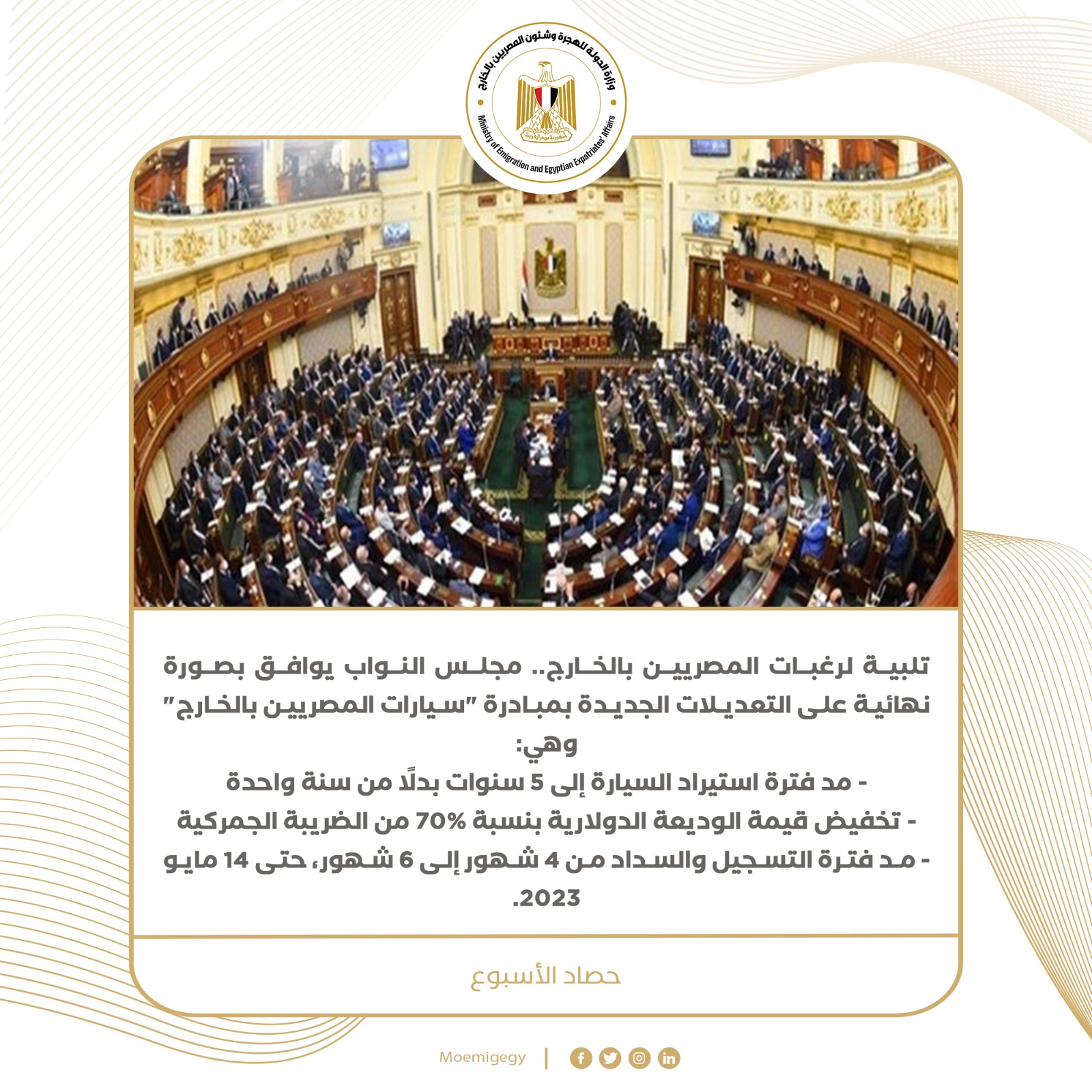 مجلس النواب يوافق بصورة نهائية على التعديلات الجديدة بمبادرة “سيارات المصريين بالخارج” وهي: – مد فترة استيراد السيارة إلى 5 سنوات بدلًا من سنة واحدة- تخفيض قيمة الوديعة الدولارية بنسبة 70% من الضريبة الجمركية- مد فترة التسجيل والسداد من 4 شهور إلى 6 شهور، حتى 14 مايو 2023. وزيرة الهجرة تلتقي أبناء الجاليات المصرية في تونس والمغرب والجزائر.