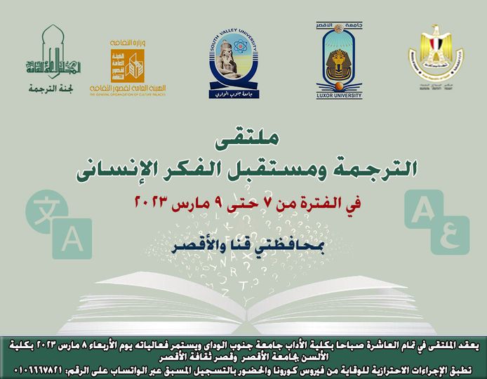ينظم المجلس الأعلى للثقافة ملتقى ” الترجمة بعنوان “الترجمة ومستقبل الفكر الإنساني”، والذي ينظمه لجنة الترجمة ، بالتعاون مع جامعة جنوب الوادى؛ وجامعة الأقصر، وهيئة قصور الثقافة، وذلك في العاشرة صباحا بكلية الأداب جامعة جنوب تحت رعاية الدكتورة نيفين الكيلانى وزيرة الثقافة؛ والدكتورهشام عزمي الأمين العام للمجلس الأعلى للثقافة؛