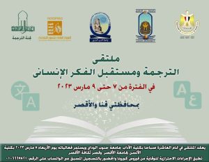 تبدأ الجلسات من اليوم ، الثلاثاء 7 مارس الحالي، و يوم الاربعاء 8 مارس بكلية الأقصر ويتضمن الملتقى: اليوم الأول: بكلية الأداب جامعة جنوب الوادى الندوة الأولى 12:10 صباحًا بعنوان ” سبل إعداد المترجم” يدير الندوة : الدكتور أنور مغيث أستاذ الفلسفة الحديثة والمعاصرة جامعة حلوان، ويشارك به كل من: الدكتور عاصم العماري أستاذ اللغة الألمانية بكلية الألسن جامعة عين شمس، والدكتور ماجد الجبالي رئيس قسم اللغة البرتغالية بكلية الألسن جامعة أسوان٧والندوة الثانية: بعنوان ” قضايا الترجمة ووسبل دعمها وجوائزها”يدير الجلسة: الدكتور عاصم العمارى، ويشارك بها كل من: الدكتور أنور مغيث، والدكتور سيد رشاد الأستاذ المساعد بقسم اللغات الإفريقية بكلية الدراسات الأفريقية العليا جامعة القاهرة اليوم الثانى بكلية الألسن ل جامعة الأقصرالندوة الأولى بعنوان “دكتورعنانى ورسالة المترجم”يدير الجلسة : الدكتور ماجد الجبالي، ويشارك بها كل من: الدكتورة منى طلبة أستاذ الأدب المقارن قسم اللغة العربية بكلية الألسن عين شمس، والدكتور انور مغيث، والدكتور سيد رشاد الندوة الثانية بعنوان ” الترجمة والابداع”- يدير الجلسة : الدكتور سيد رشاد، ويشارك بها كل من: الدكتور عاصم العماري، والدكتور ماجد الجبالي، والدكتور منى طلبة. كما يتضمن الملتقى ندوة بقصر ثقافة قنا 9:7 مساء تزامنا مع يوم المرأة العالمى، بعنوان “مسيرة تحرر المرأة في الثقافات العالمية”.يدير الجلسة : الدكتور عاصم العماري، ويشارك بها كل من: الدكتور انور مغيث، والدكتور سيد رشاد، والدكتور ماجد الجبالي.