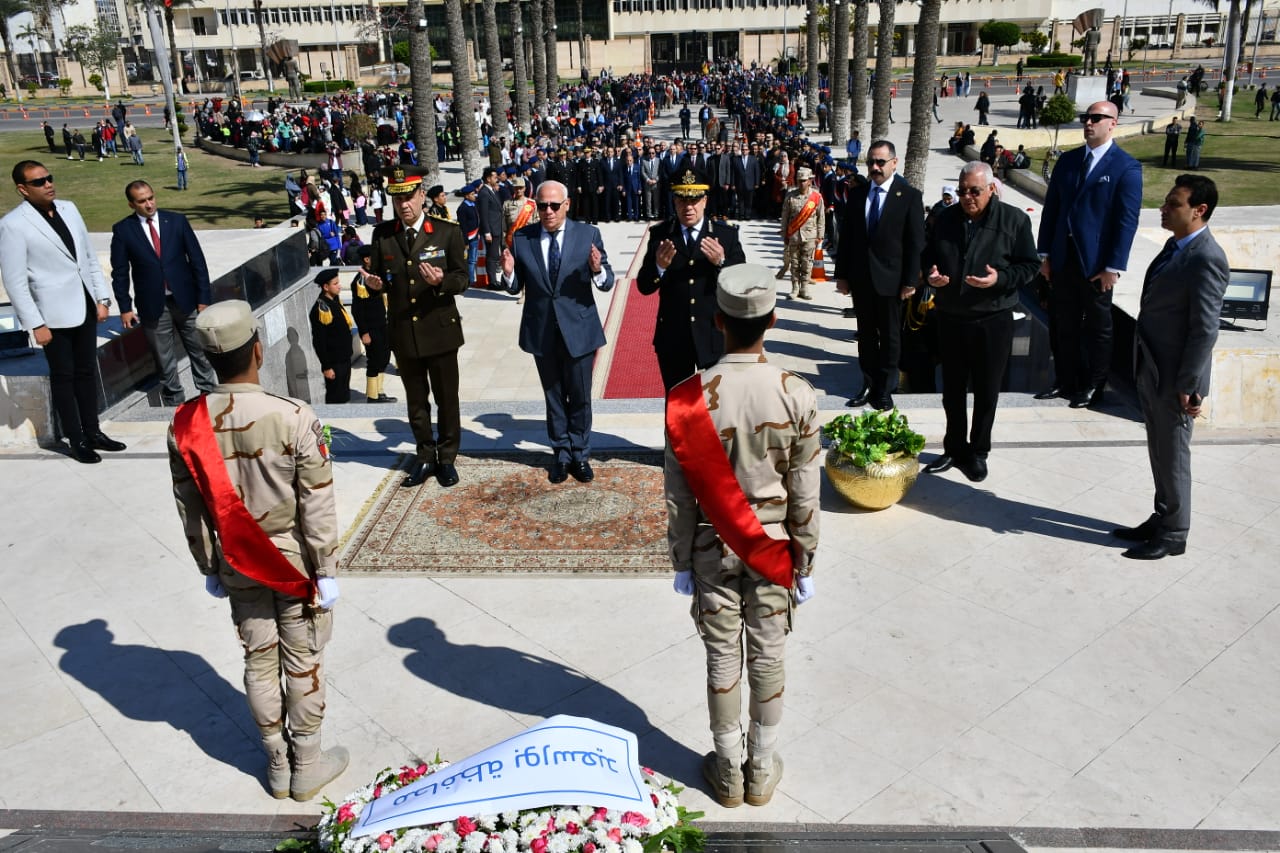 محافظ بورسعيد يضع إكليلا من الزهور علي النصب التذكاري للشهداء بميدان المسلة