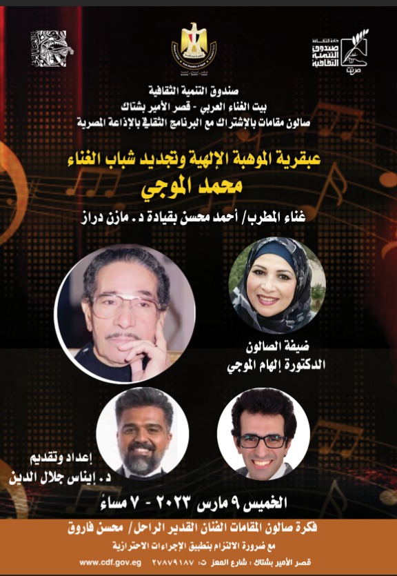بمناسبة ذكرى رحيل سيدة الغناء العربي “أم كلثوم”، يستضيف بيت الغناء العربى “بقصر الأمير بشتاك” – بشارع المعز، التابع لقطاع صندوق التنمية الثقافية “صالون مقامات”، والذي يقام هذا الشهر تحت عنوان “أشعار في حدائق الأوتار”، بالاشتراك مع البرنامج الثقافى بالإذاعة المصرية.